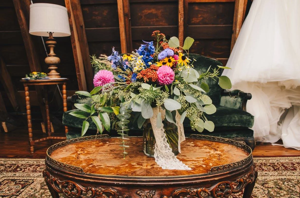 The bride's bouquet was wrapped in ivory lace while waiting for the ceremony in the loft of the barn. She made specific color and style requests and those were matched with seasonal blooms that best represented her requests. I love the pops of pink dahlias and yellow black-eyed susans. To add more texture and fragrance, eucalyptus, rosemary, and chamomile were added.