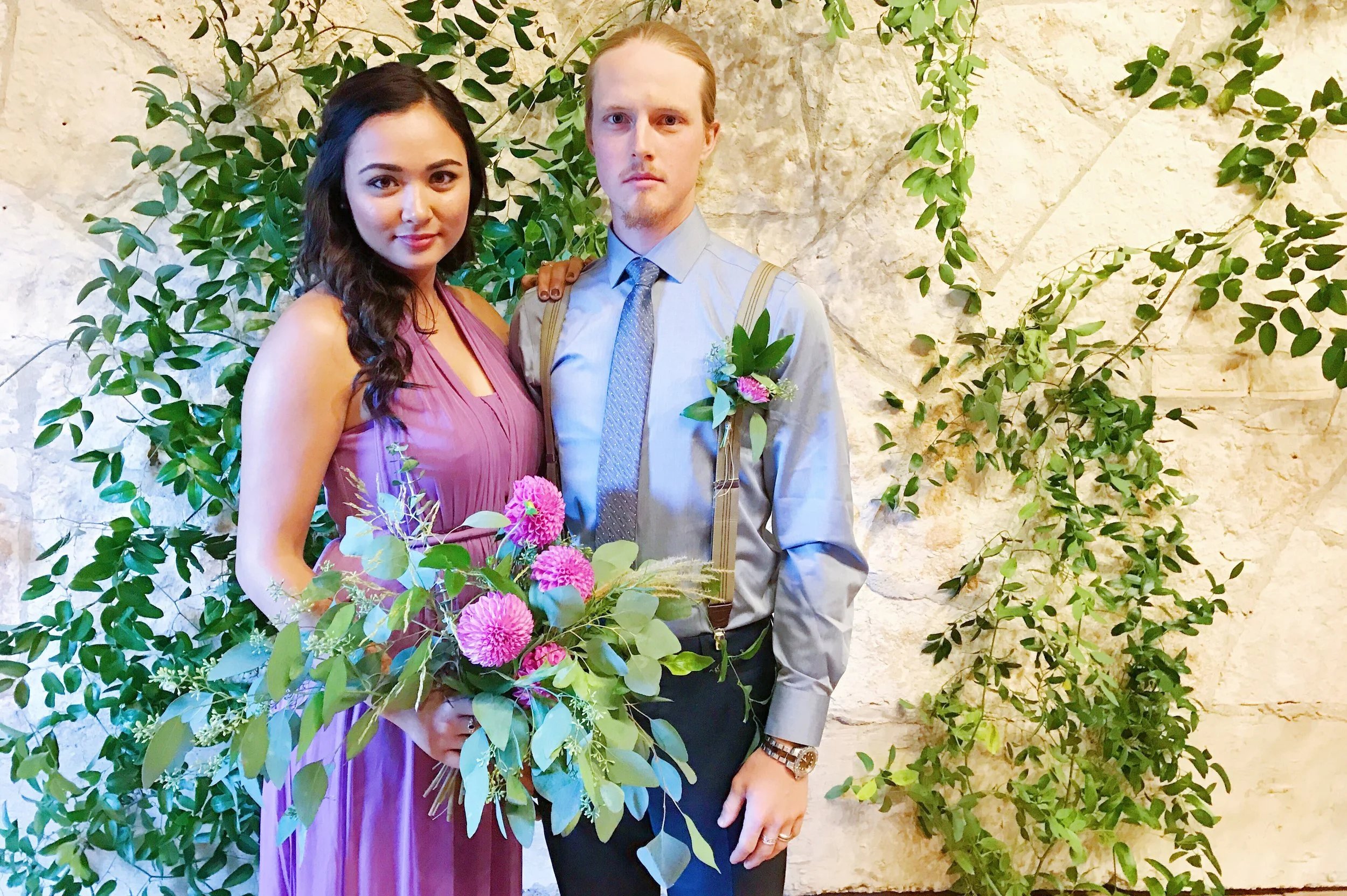 This cross made from cedar stood about 9 feet tall and served as the centerpiece of the ceremony's backdrop. The couple wanted it to be adorned with flowers and greenery, much like the bouquets and boutonnieres, but also wanted to be able to reuse it for the sweetheart table at the reception.