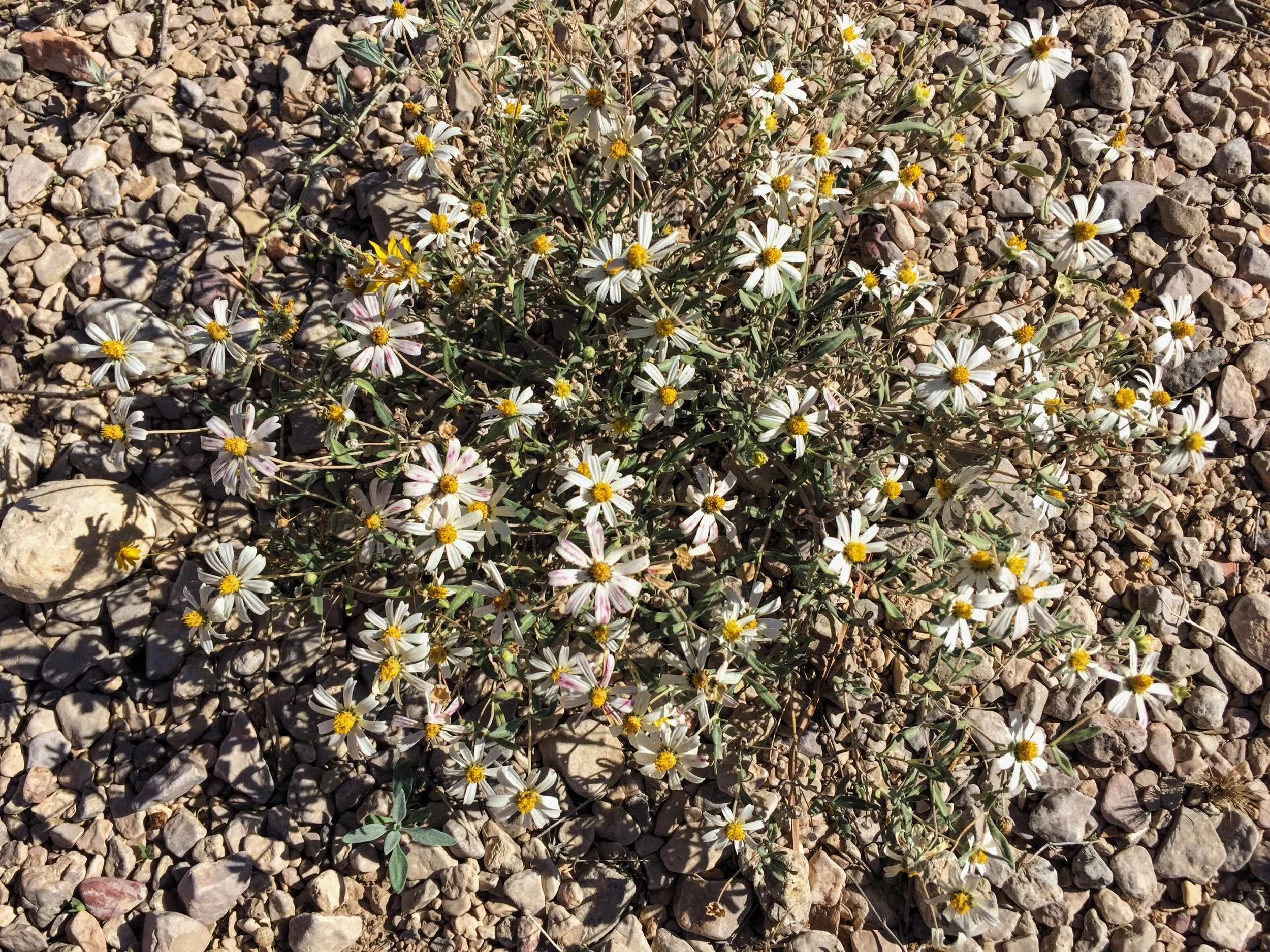 I am fairly confident that this is Machaeranthera tanacetifolia, or Tahoka Daisy. This specimen has a smaller central disk and fewer petals than the typical Tahoka Daisy, but the more meager appearance could be expected with a plant found in harsher conditions like this one. Physically, it better represents M. bigelovii, but it has not been recorded in Texas, so I am less apt to label it as such.