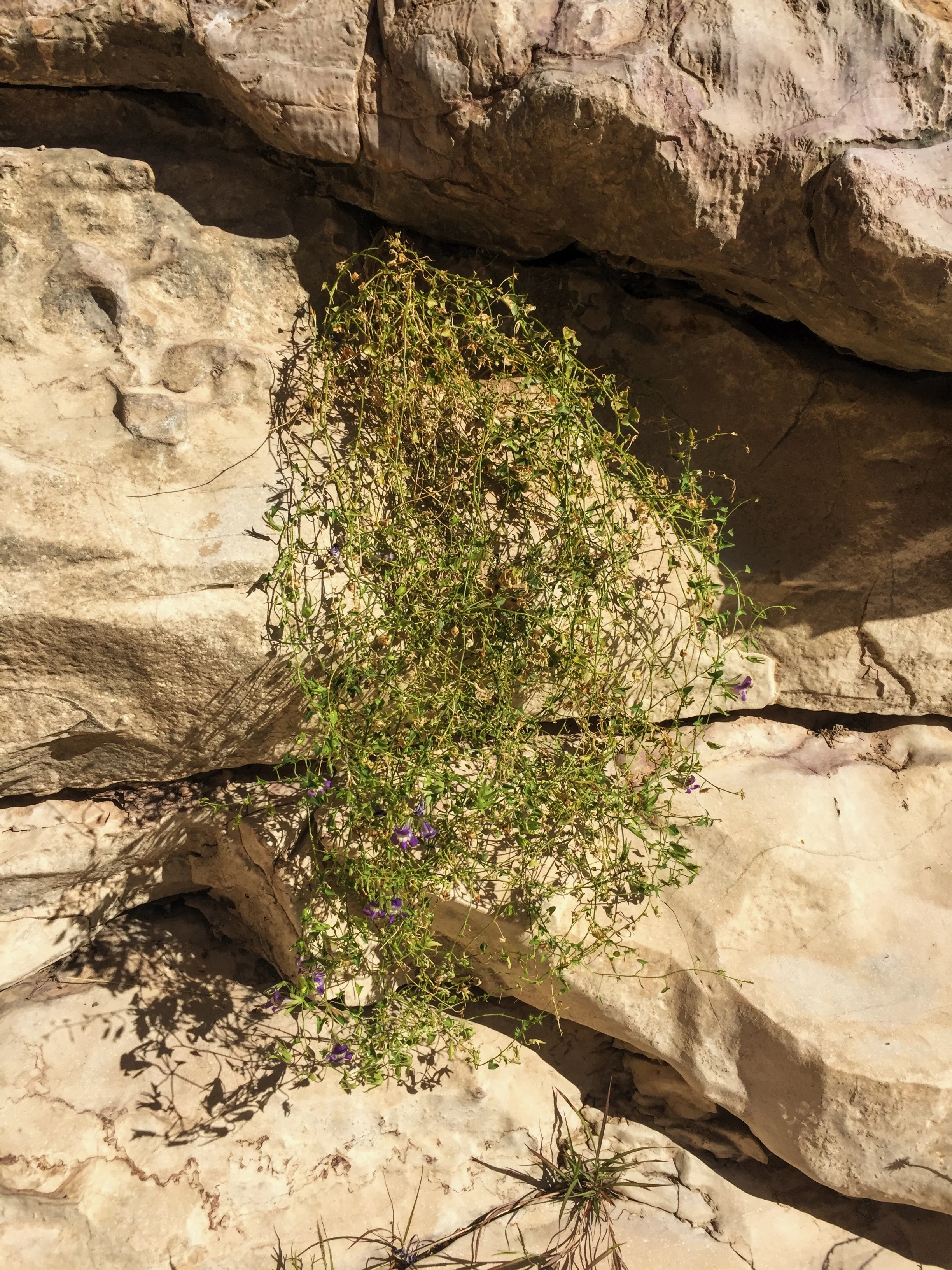 Snapdragon Vine is a loosely-twining plant with blooms that resemble snapdragon blooms, but is especially more tolerant of heat and sun. This particular plant is shown cascading from a rock crevice in a canyon wall.