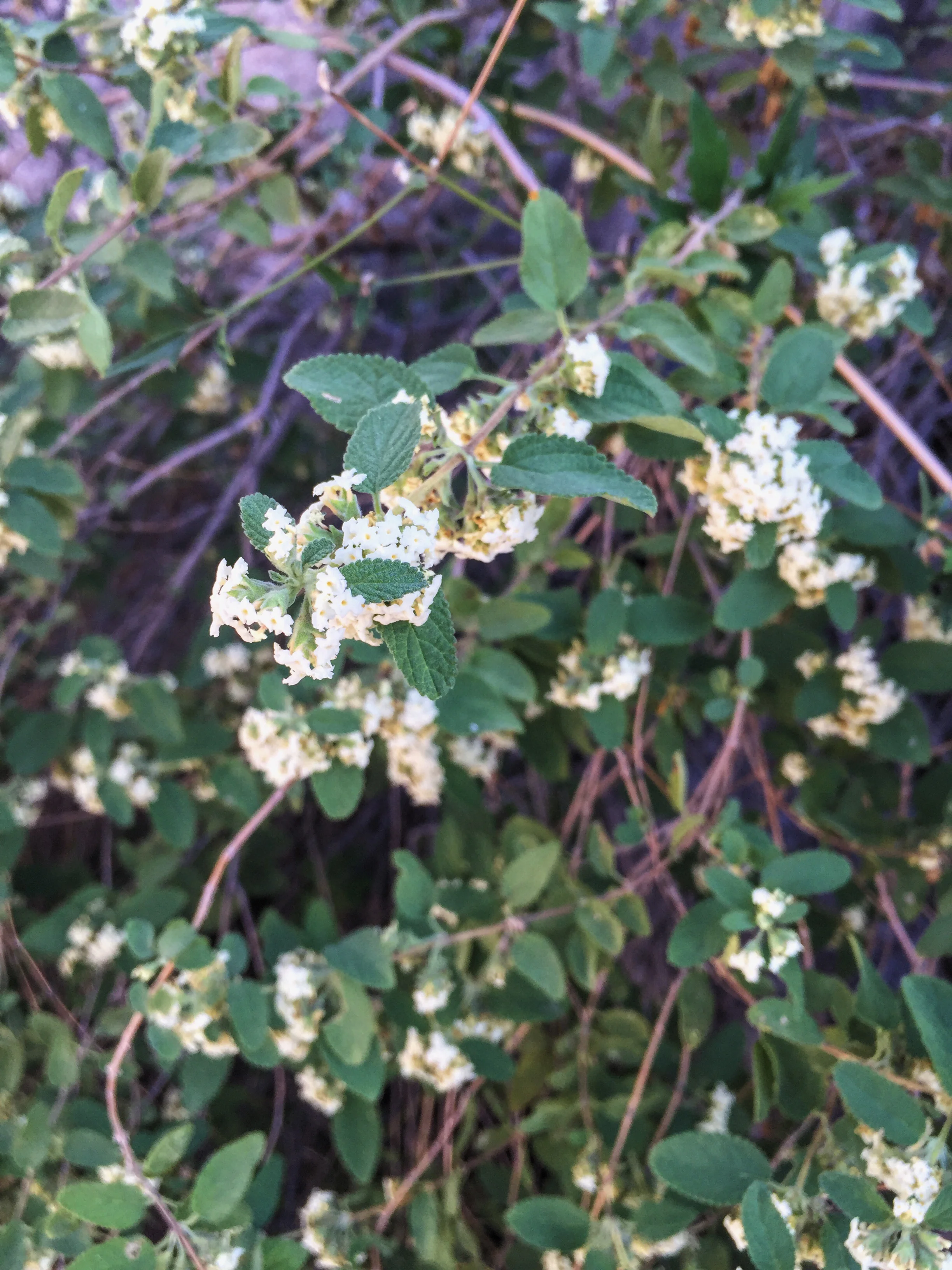 Mexican Lantana grows from the rocky cliffside with showers of cream-colored flowers that will eventually turn to orange and violet.