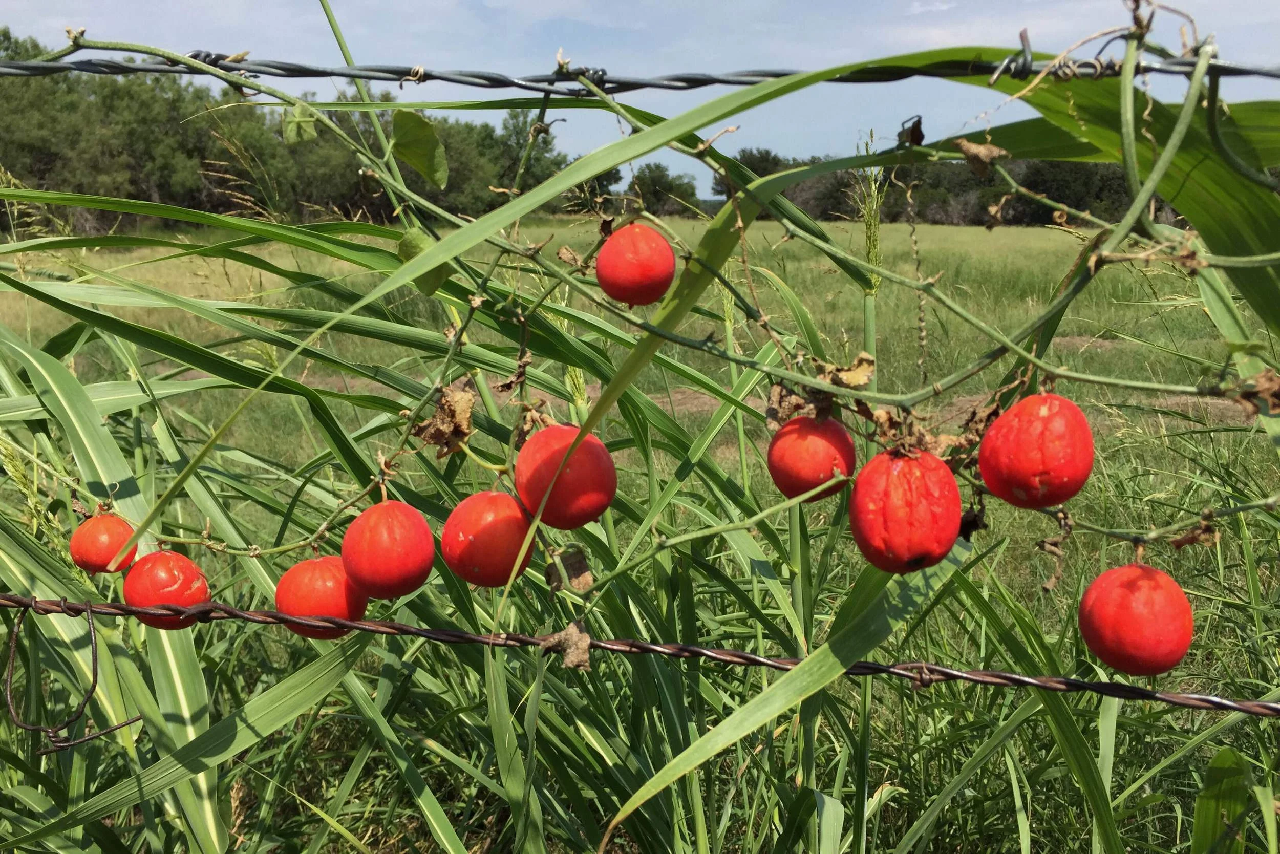 Balsam Gourd is easily spotted for several reasons. The red fruit hang like lanterns from the vining stems. Birds drop these fruits' seeds along fence rows, and then the fence serves as the trellis, continuing a never-ending cycle. Before the land was divided and separated for agriculture, a shrub or tree served as the best trellis. And how convenient that many roads follow fence lines? The leaves of this plant are thick and waxy, much like a succulent. And if the base of the plant can be located, one will find a tuber, forming a large caudex with age.