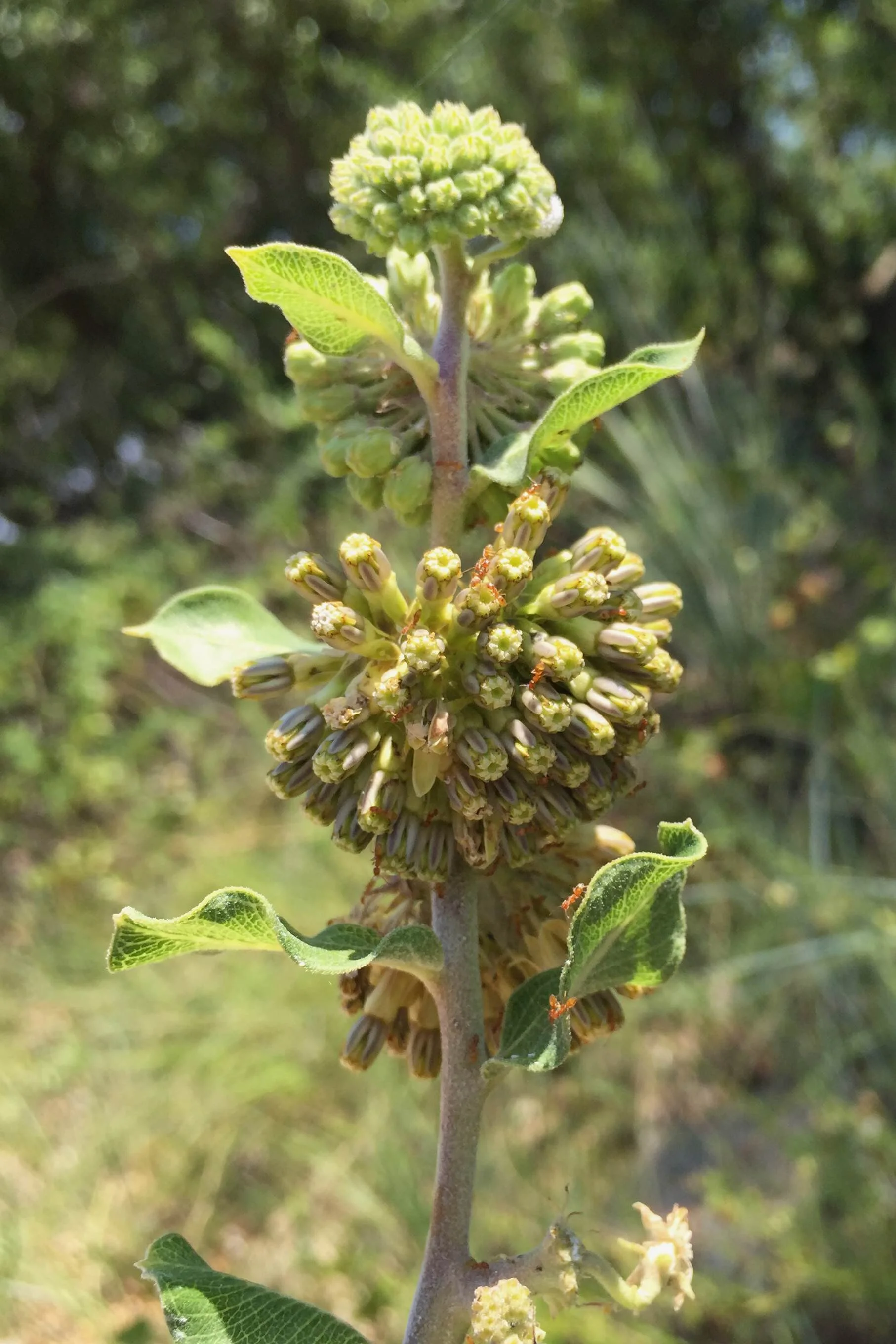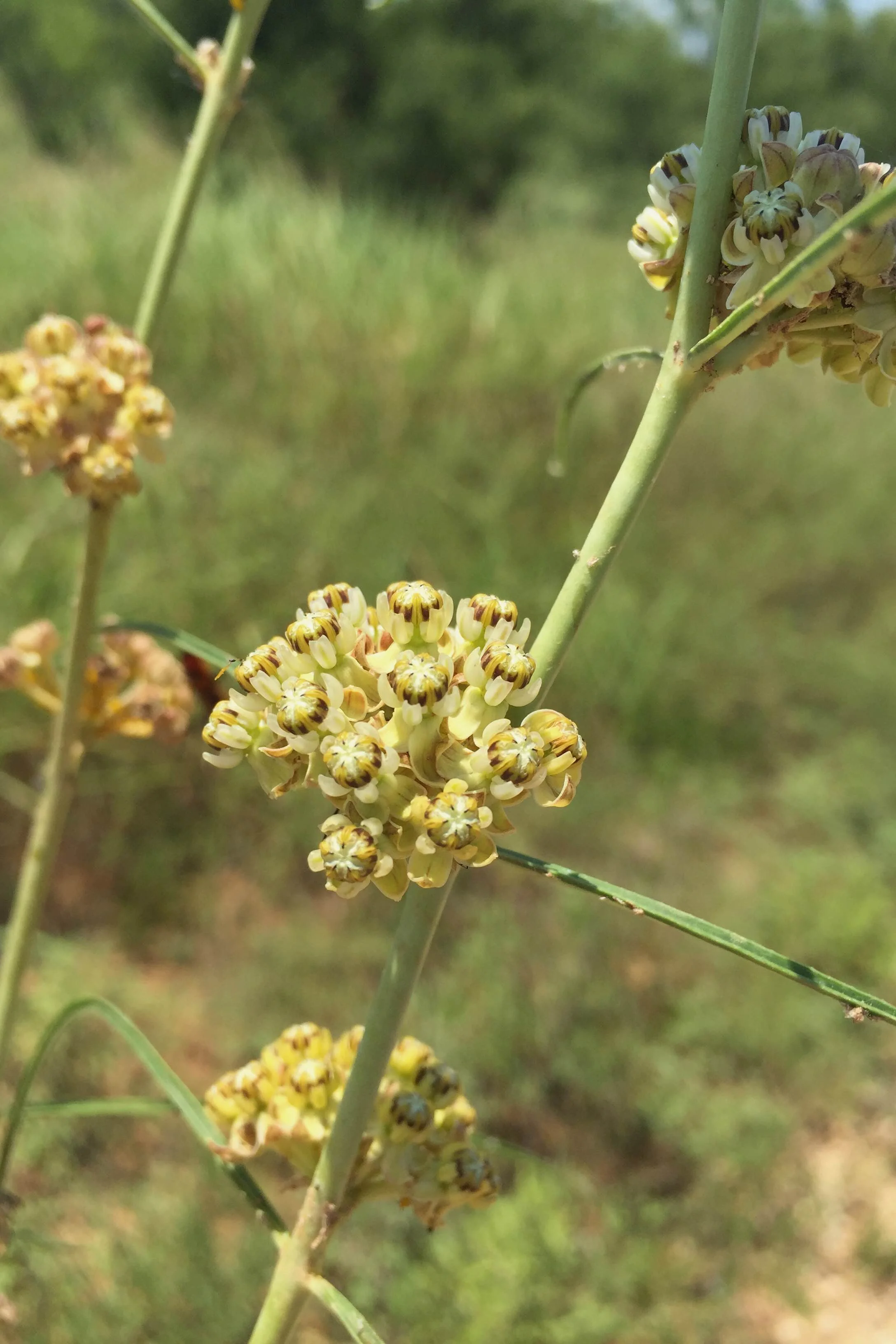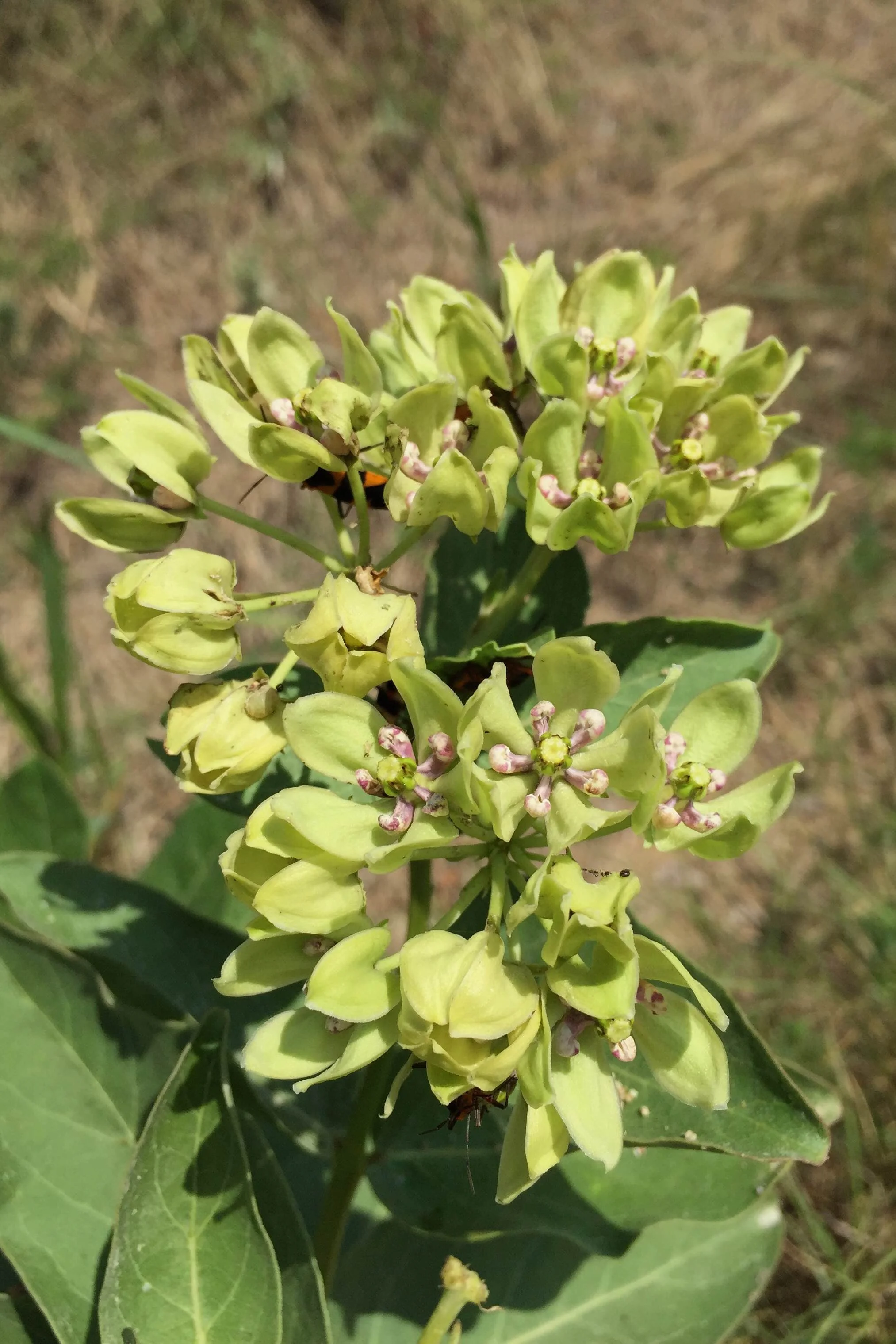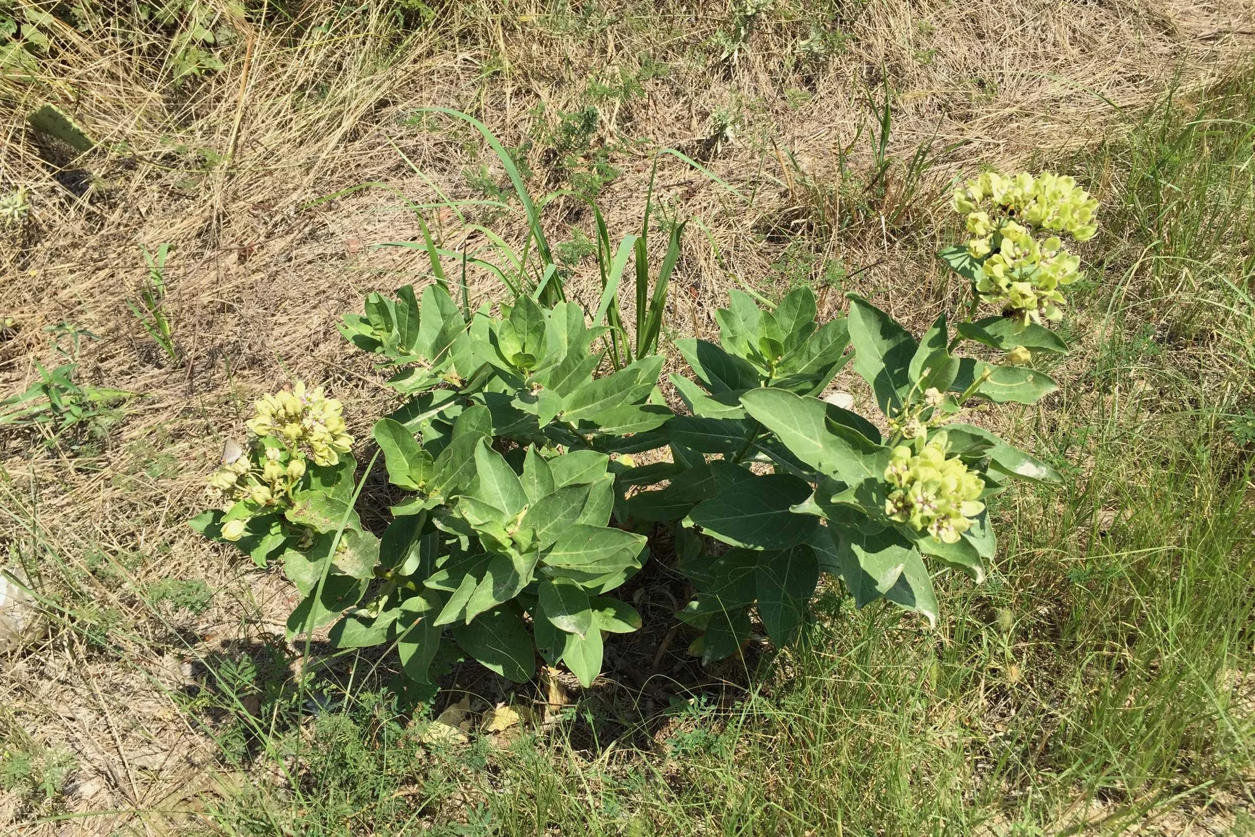 Another Milkweed species, Asclepias viridiflora, is single-stemmed and grows up to 3 feet tall. Hemispherical blooms adorn the top, alternating on the crooked stems and nodding under their own weight. Tinges of pink and purple can be detected in the leaf margins and blooms.
