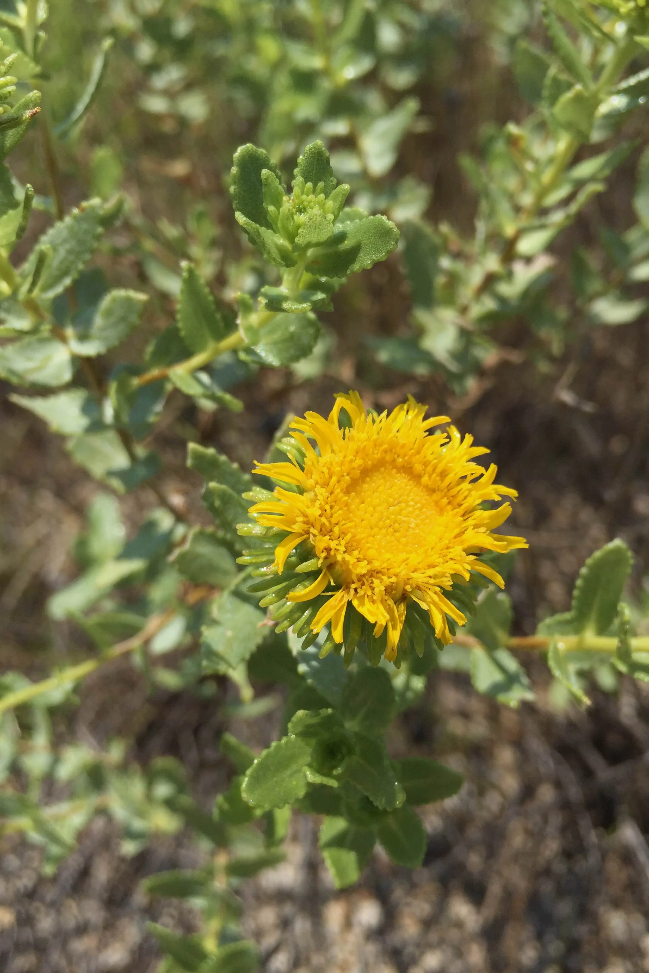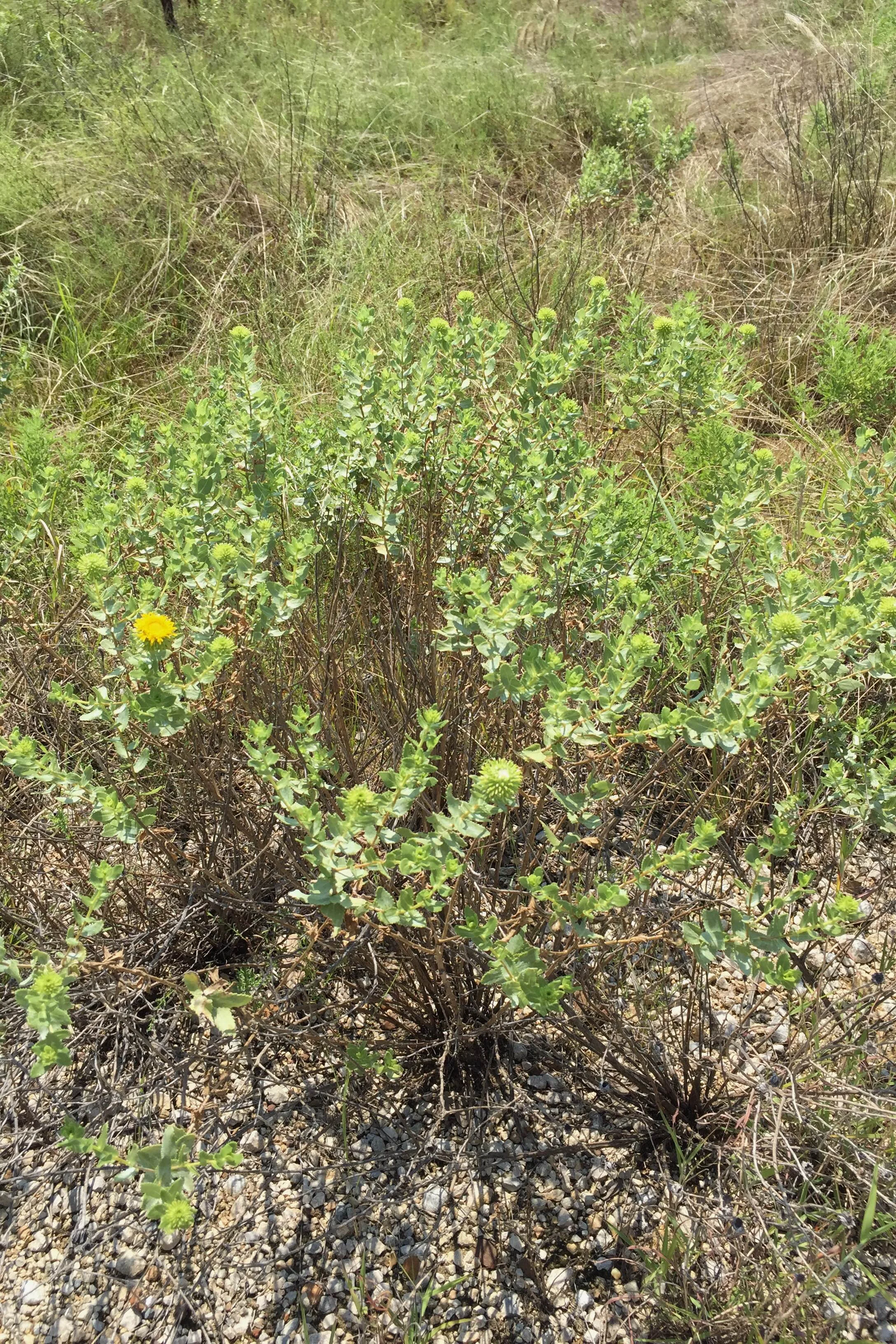 There are many Grindelia species occurring in Texas, but this species stands out because of the frilled bloom that lacks single, large petals like others.
