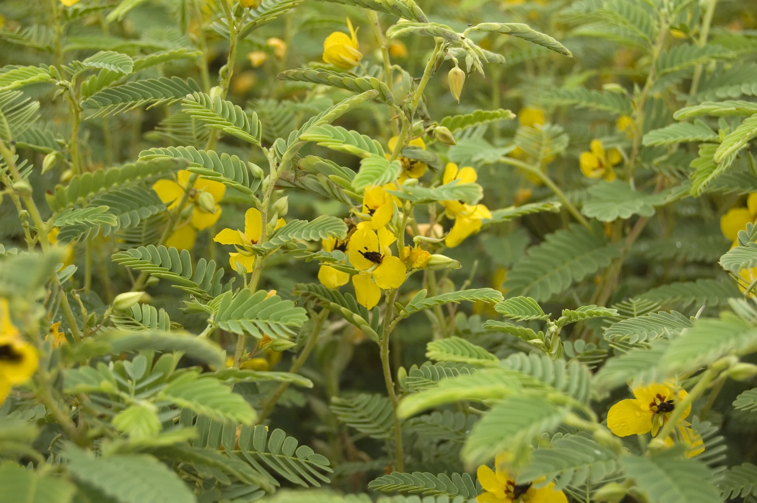 Partridge Pea occurs in much of Middle America and along the east coast. The foliage is an indicator that it belongs in the pea family, Fabaceae, and the leaves clasp shut when disturbed, giving the species another common name of "Sensitive Plant".