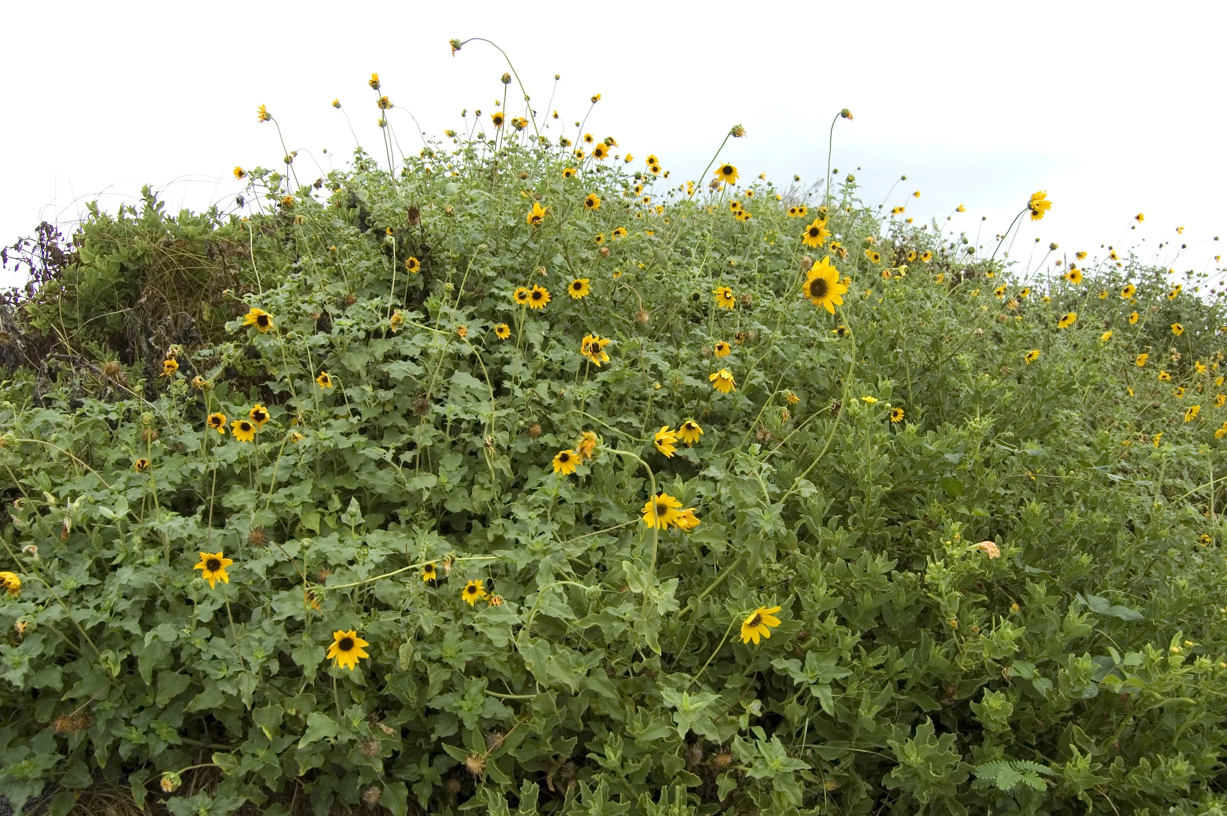 Unlike the more well-known, taller-growing sunflowers, this coastal species is shorter growing and creates mounds of smaller flowers set atop slender stems. The specimen photographed here covered an entire dune and was very attractive.