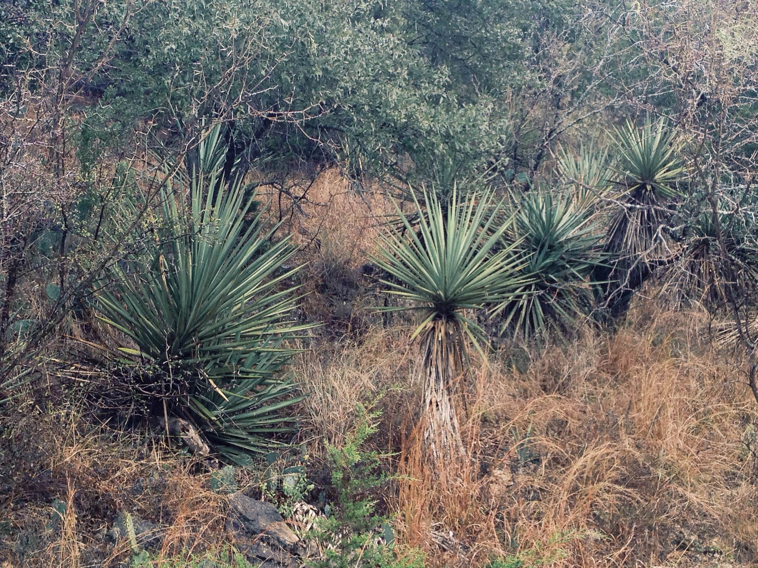 These communities of Y. constricta were found throughout the site. I'm hoping that the livestock on the property will allow some bloom spikes to go to seed this spring. Y. treculeana is peeking through the trees in the background.