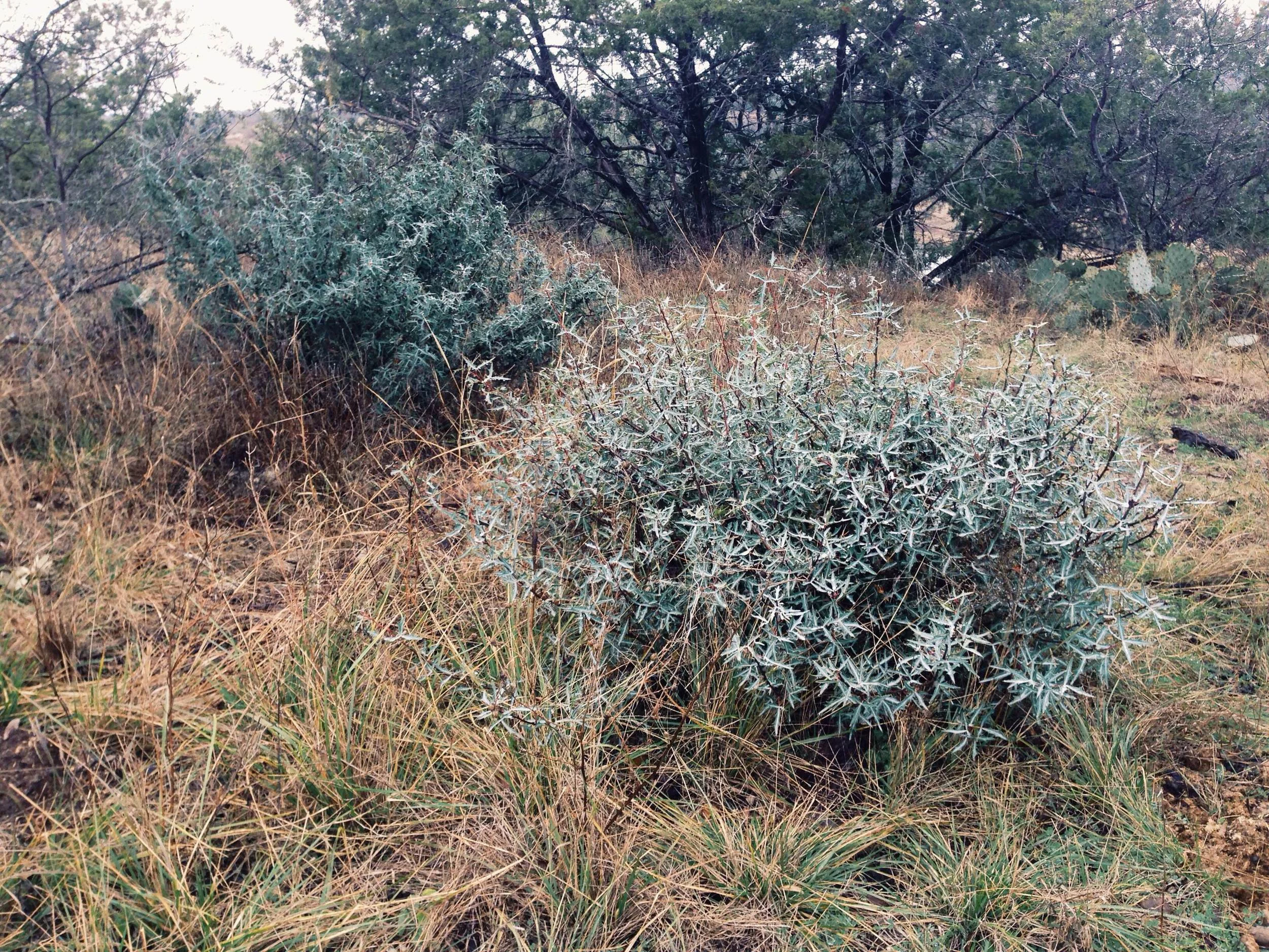 M. trifoliolata is a sharp-leaved shrub found in the western 2/3 of Texas. It's low profile serves as good cover for quail and its red fruit is prized by other birds. These specimens had an exceptional blue foliage color.