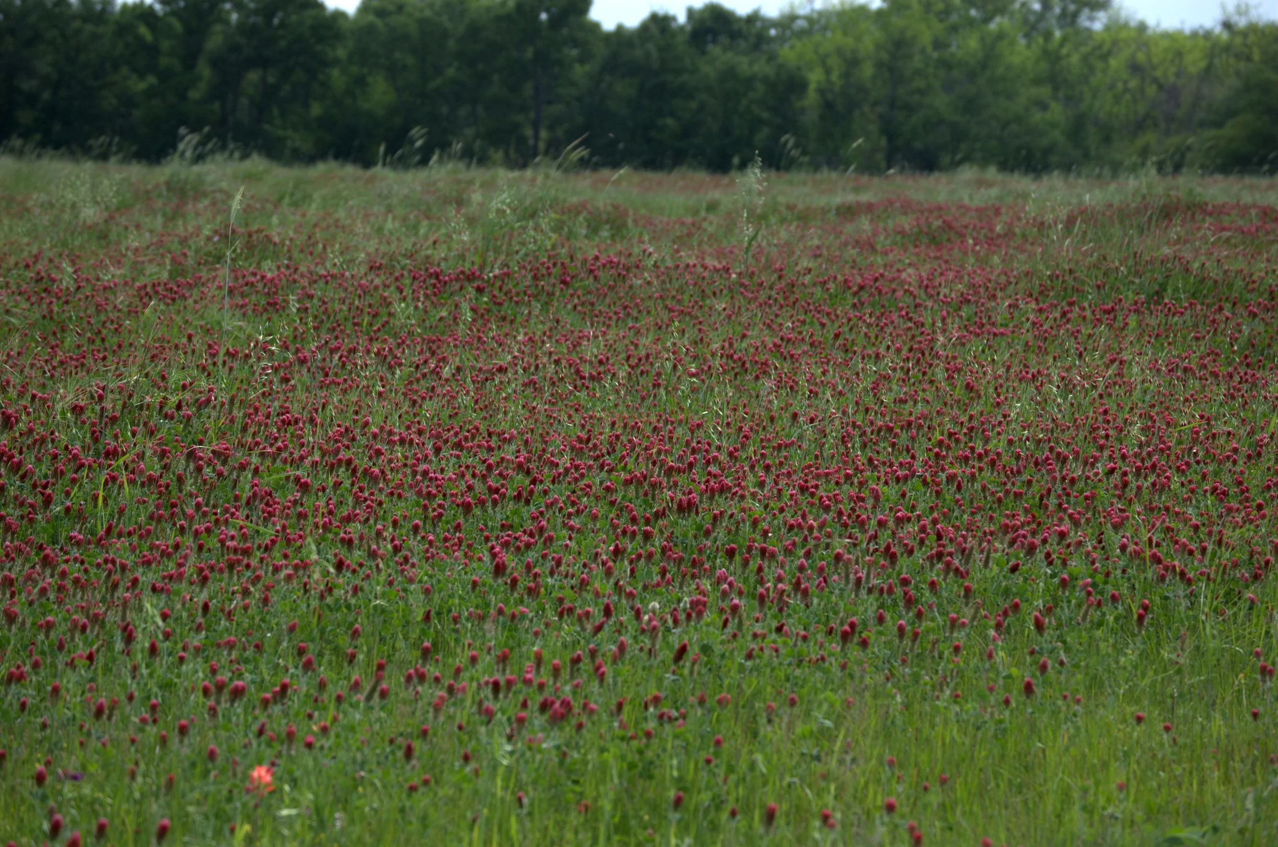 Another introduced species, but intentionally for livestock forage, Crimson Clover puts on a beautiful display of straw-like flowers. It is native to most of Europe and used as a cut crop that is baled as hay. This field was absolutely full.