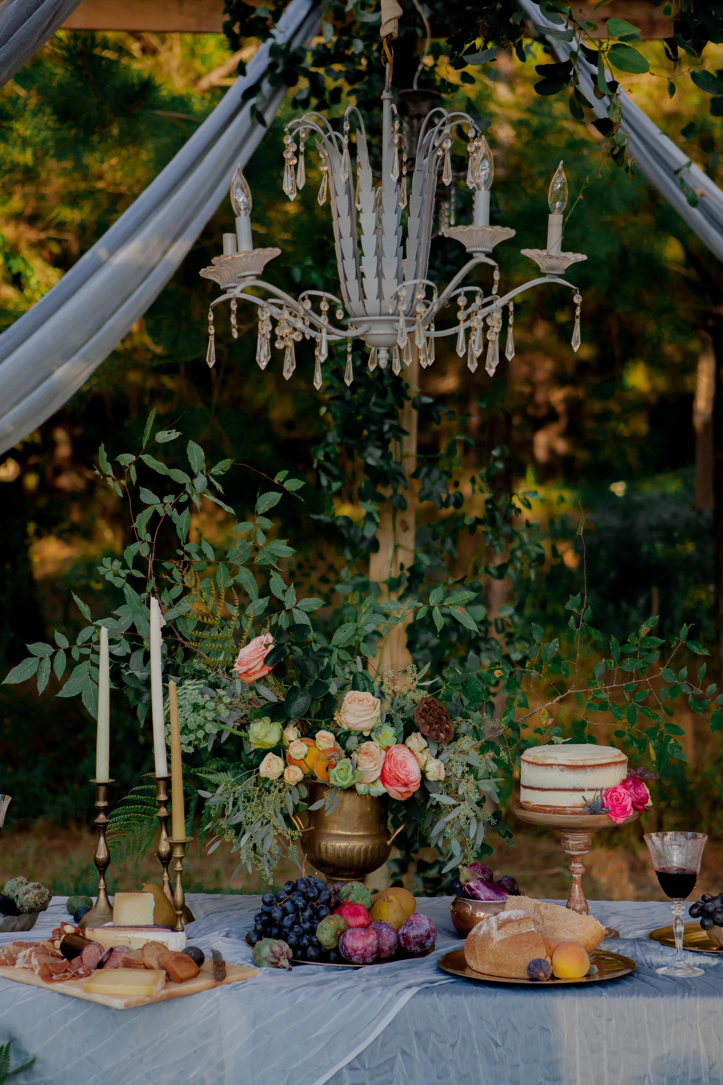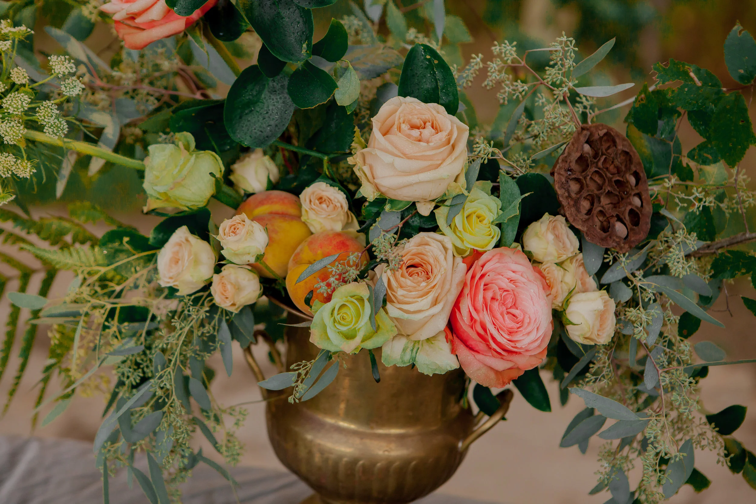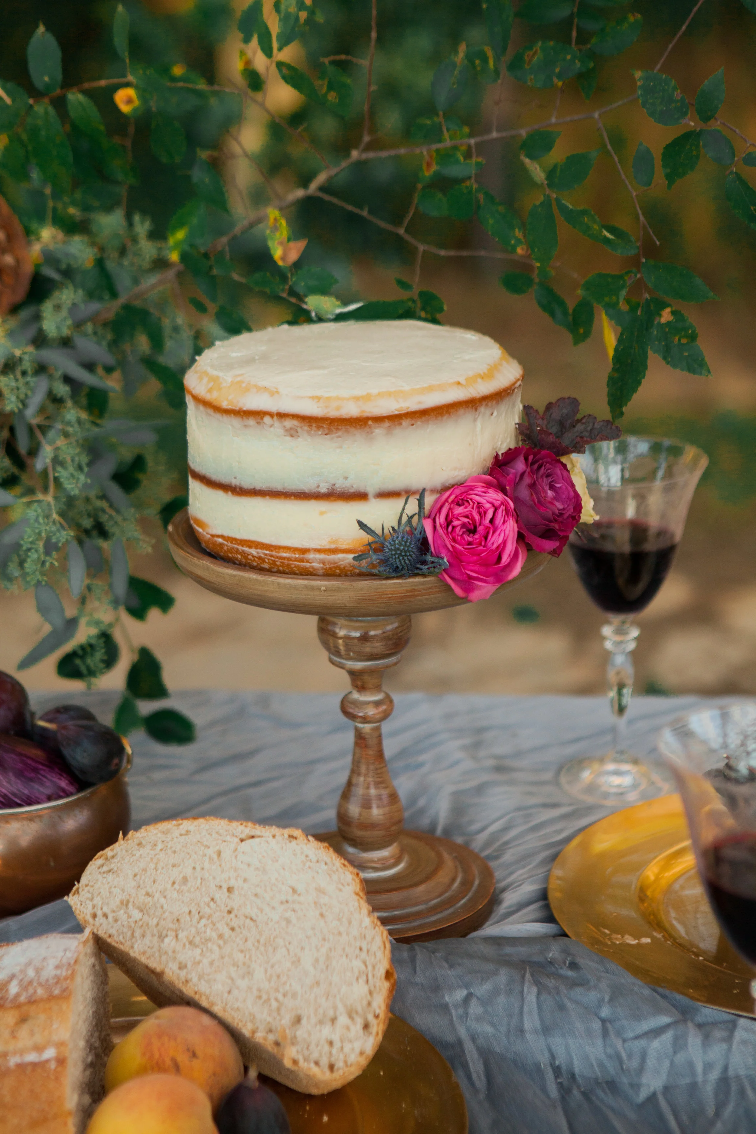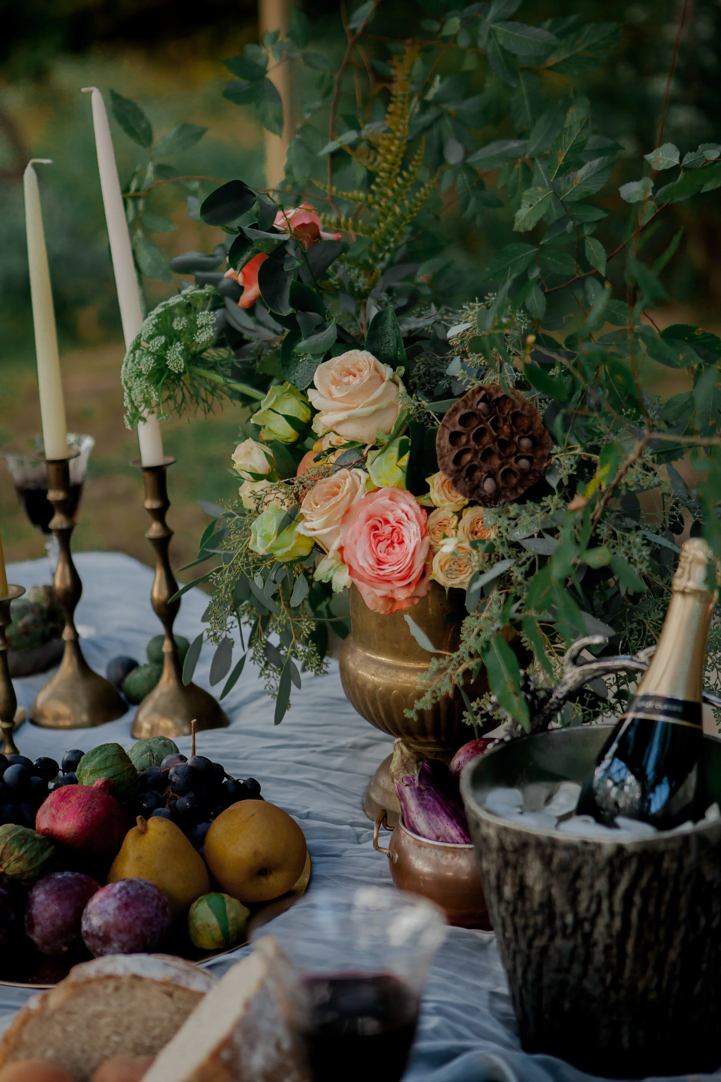 In the theme of harvest, produce, meats, and cheeses from the local market adorn the table, ready to be devoured. Brass and gold accents serve as vessels for a variety of fruit and flowers. Blush-colored blooms, foraged greens, and a naked cake set the scene.