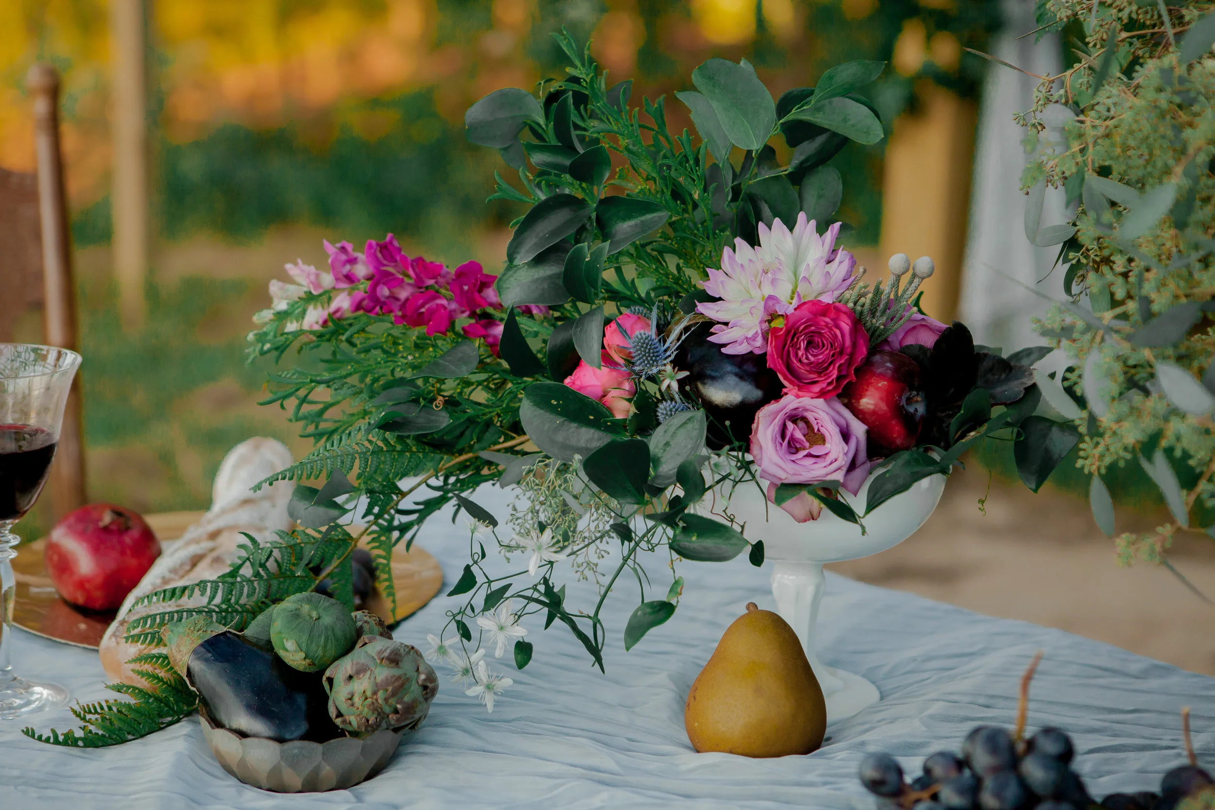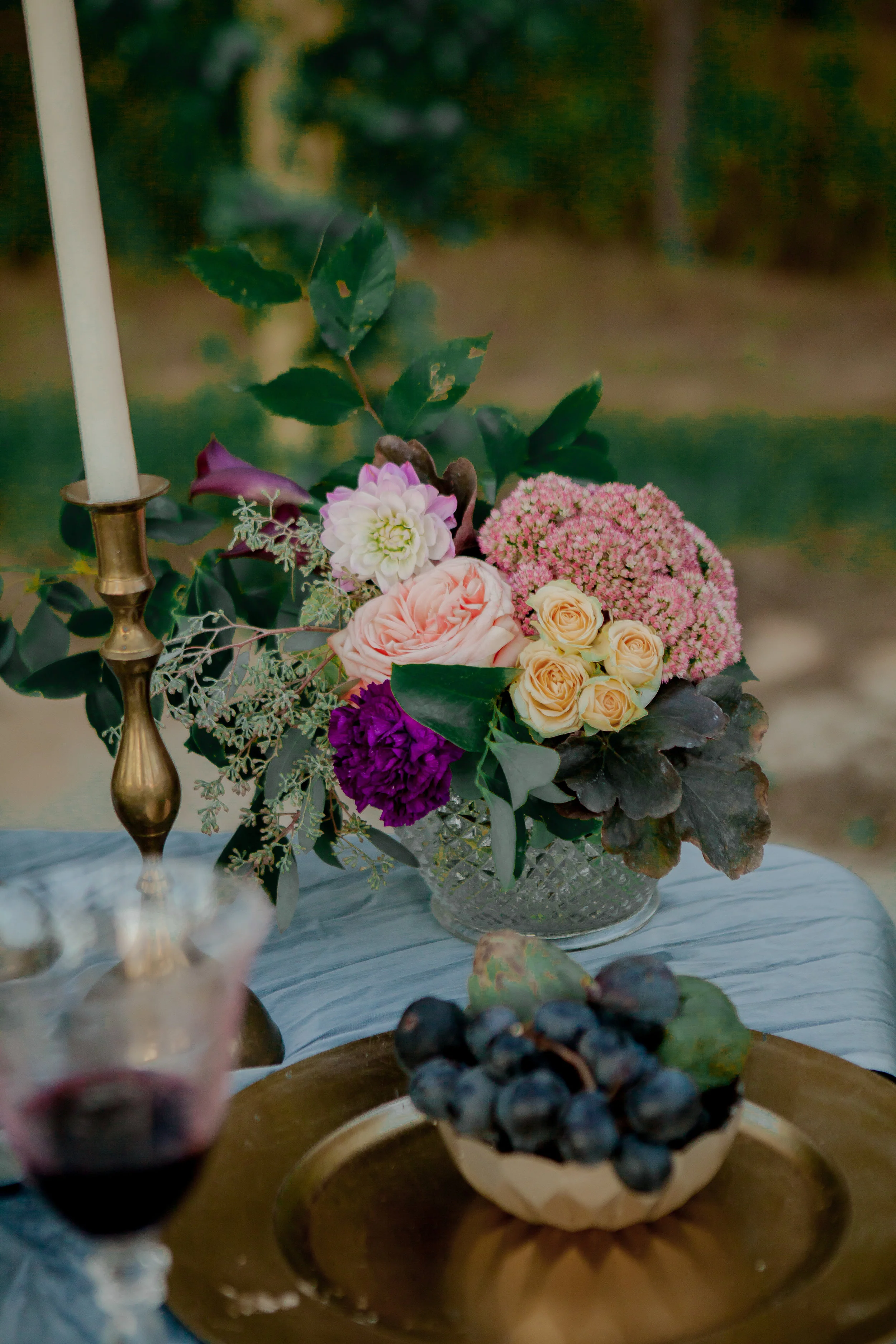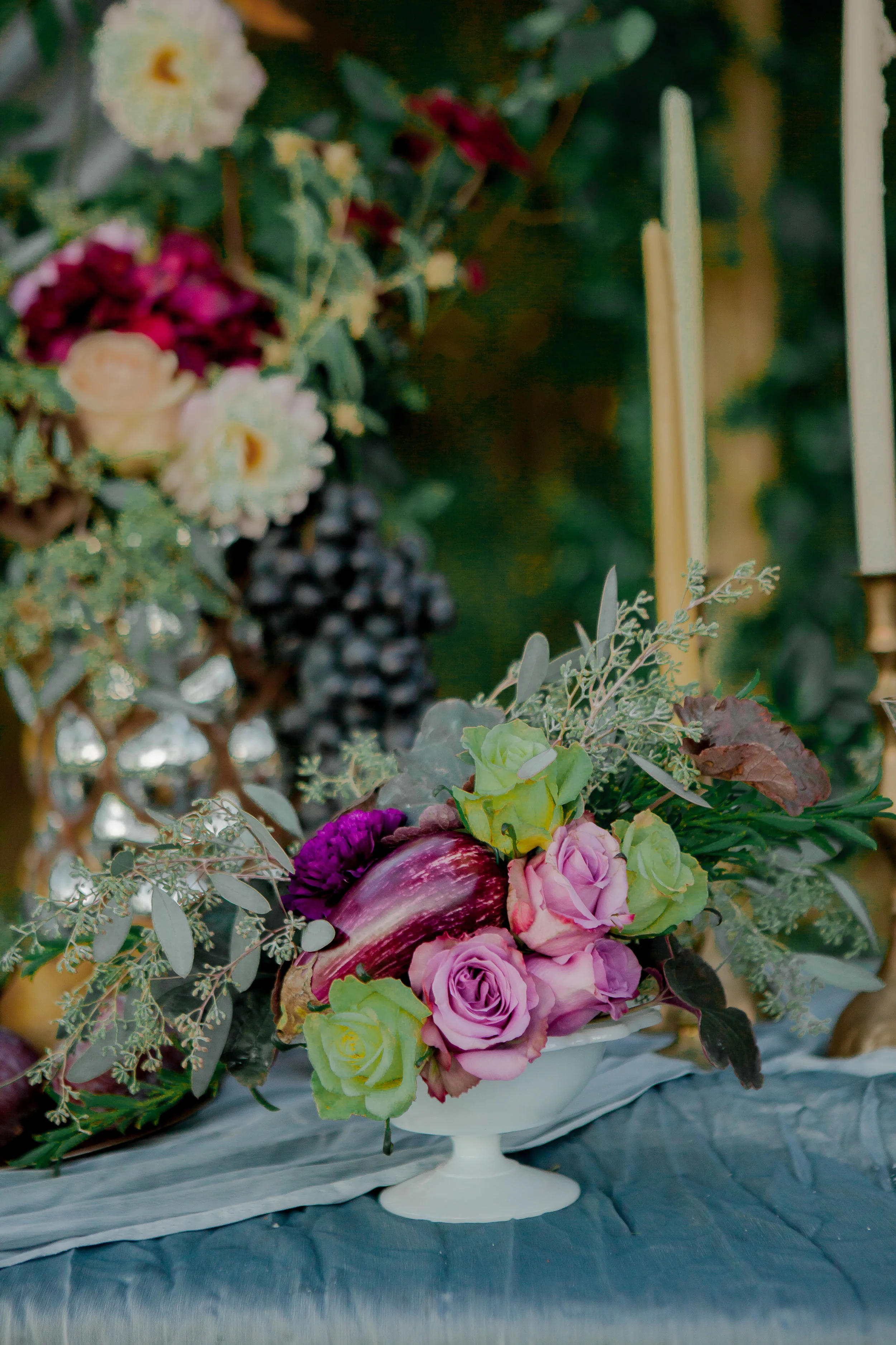 A quick switch out of the tablescape reveals deeper tones of plums, purples, and lush greens highlighted by mercury and milk glass.