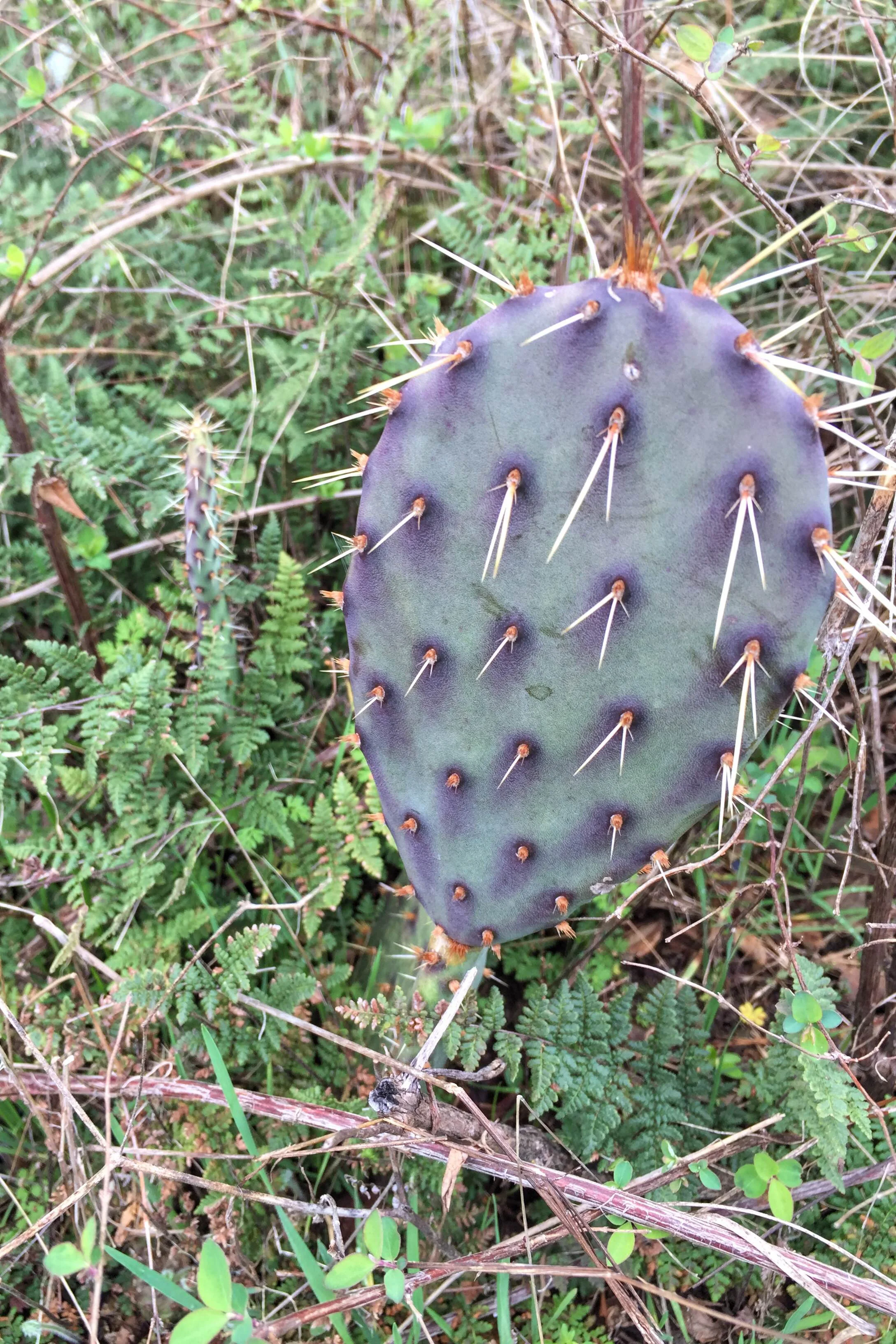 It's not often you see a low-water plant like Prickly Pear and a more wet plant like a fern growing side-by-side. But the slope here guarantees a quick drain of all rainfall, a quality essential to the survival of both species.