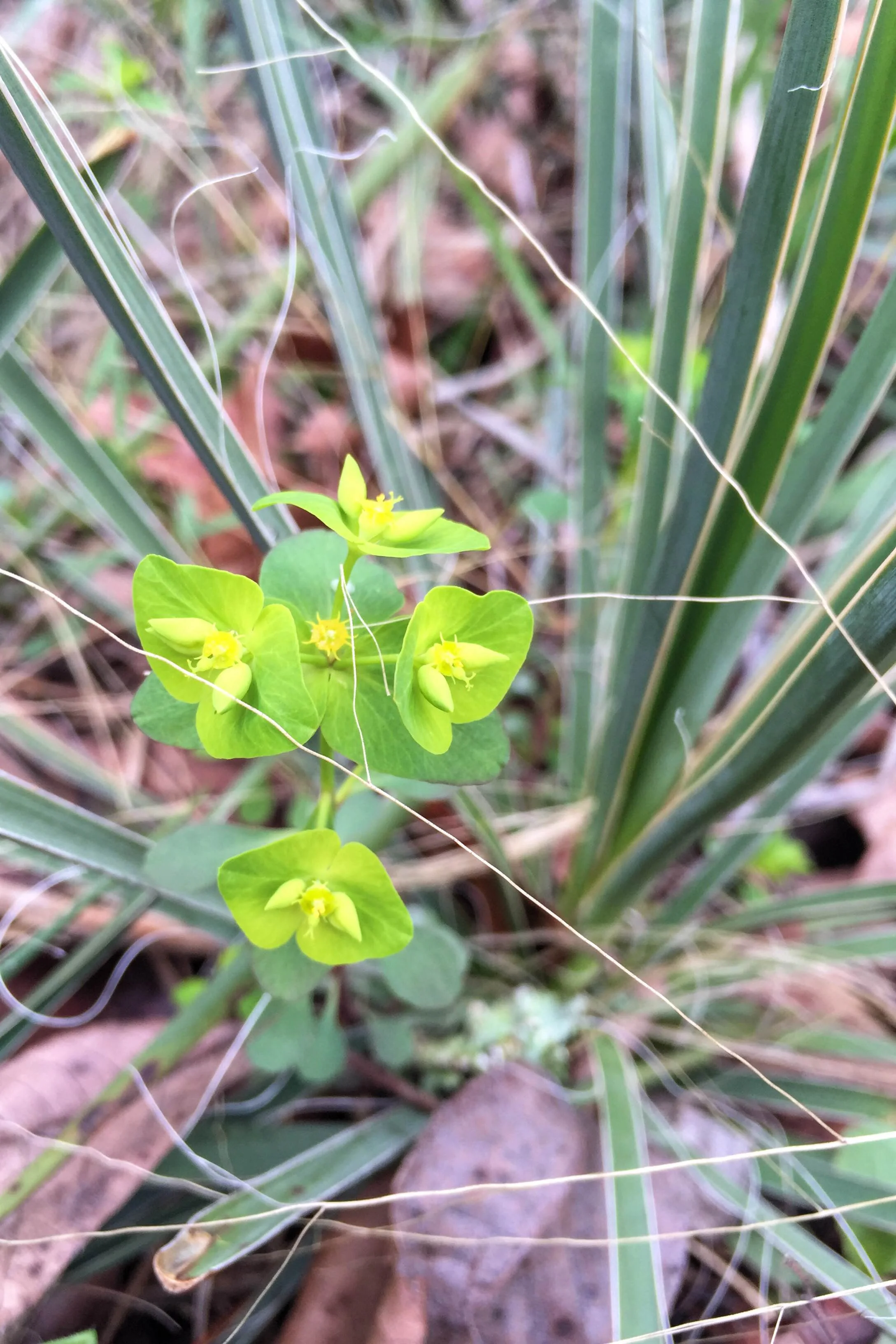 Euphorbia is one of the largest genera in the world, and they grow in all forms. This species isn't particularly showy, but the chartreuse color of the foliage and bloom made it noticeable on this cloudy day. The two large leaves under each yellow bloom are actually flower bracts, and the two "horns" are new blooms in bud stage.