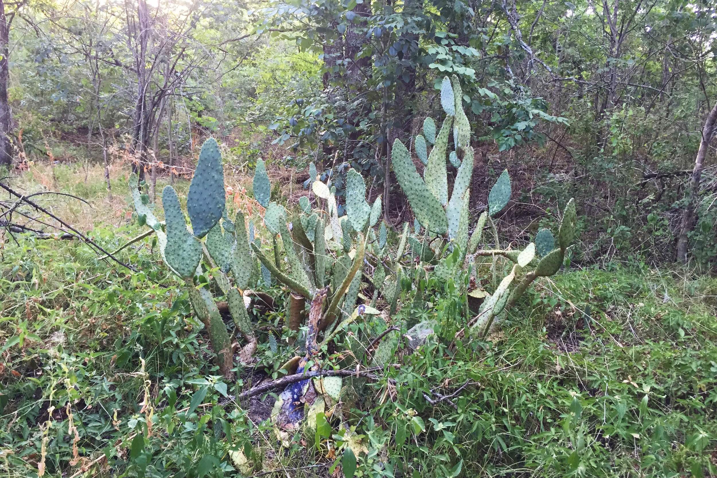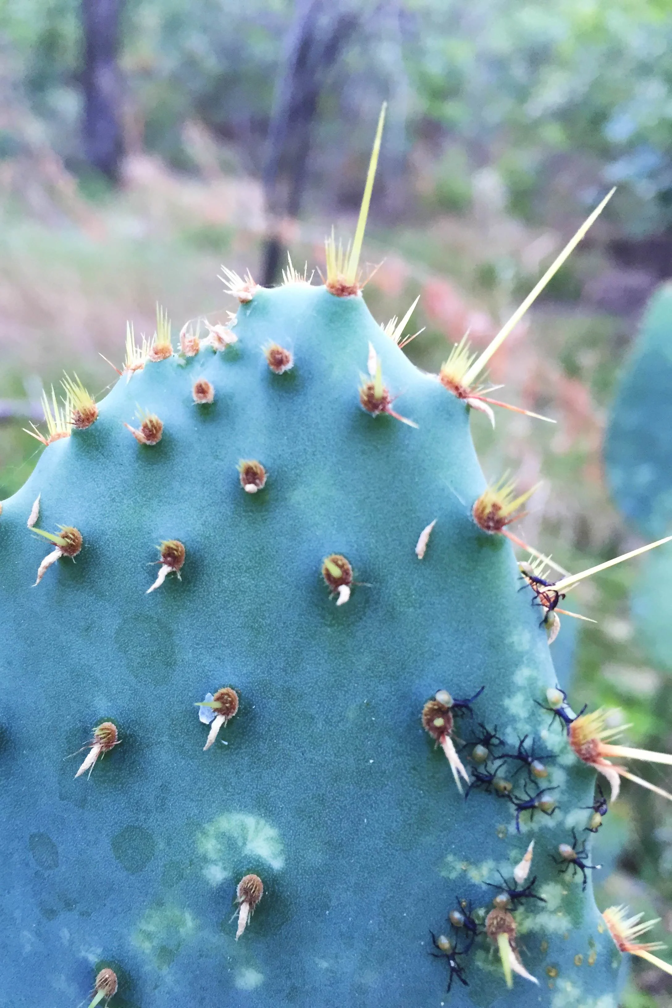 This variety of Texas native Prickly Pear was originally discovered in South Texas, but has been readily adapted to landscape applications. Being out of its native range, this specimen is undoubtedly a leftover of a former homestead. Pictured above are nymphs of Cactus Coreid, a bug that sucks nutrients from the pads of the Prickly Pear, leaving behind the discolored blotches. Traditionally, they do not have an impact on the cactus.