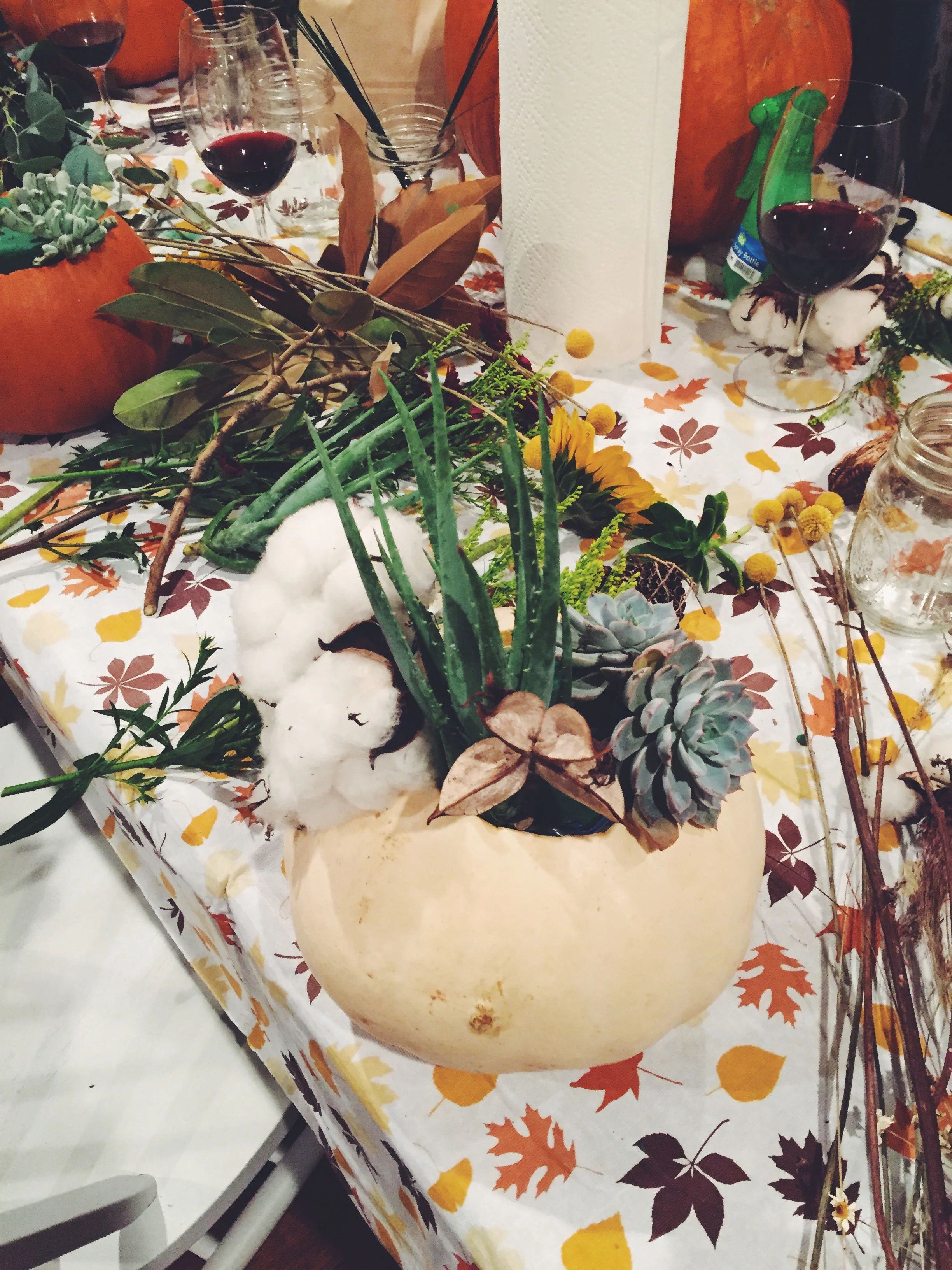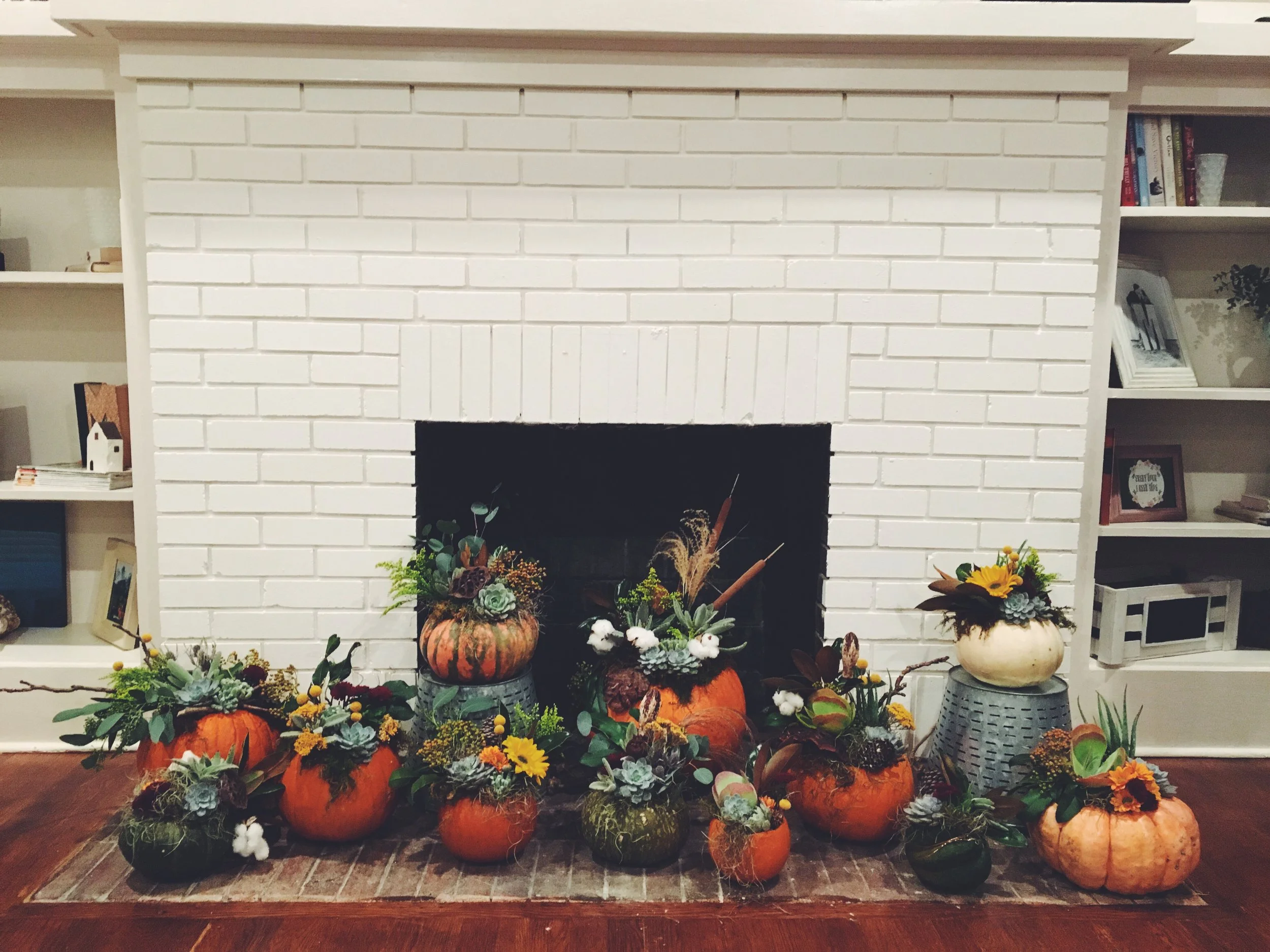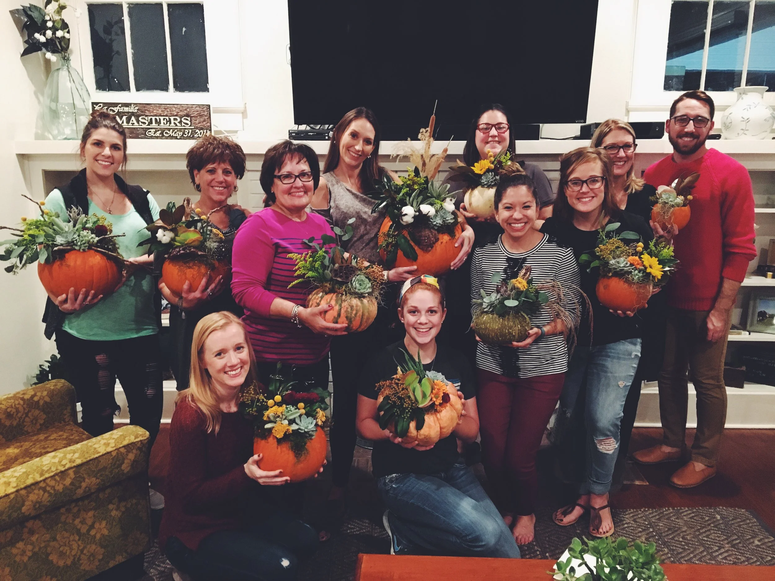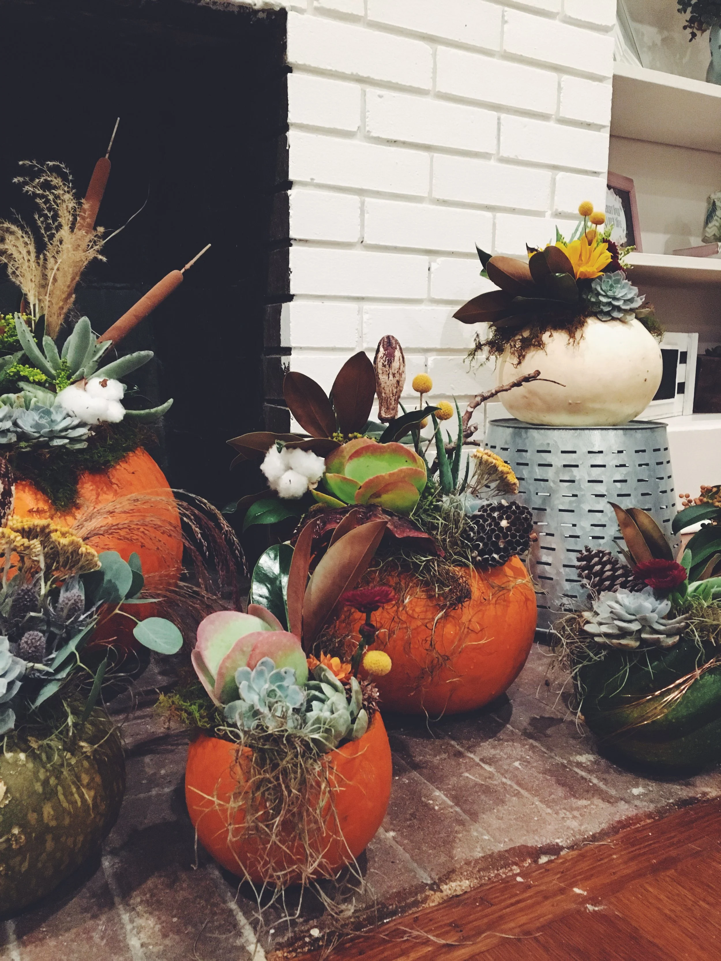 I am so fortunate to be able to offer these in-home parties for very enthusiastic hosts and their guests. The idea is that you invite your friends over, they bring a pumpkin, and I help you fill it with succulents, flora, and other elements from nature.