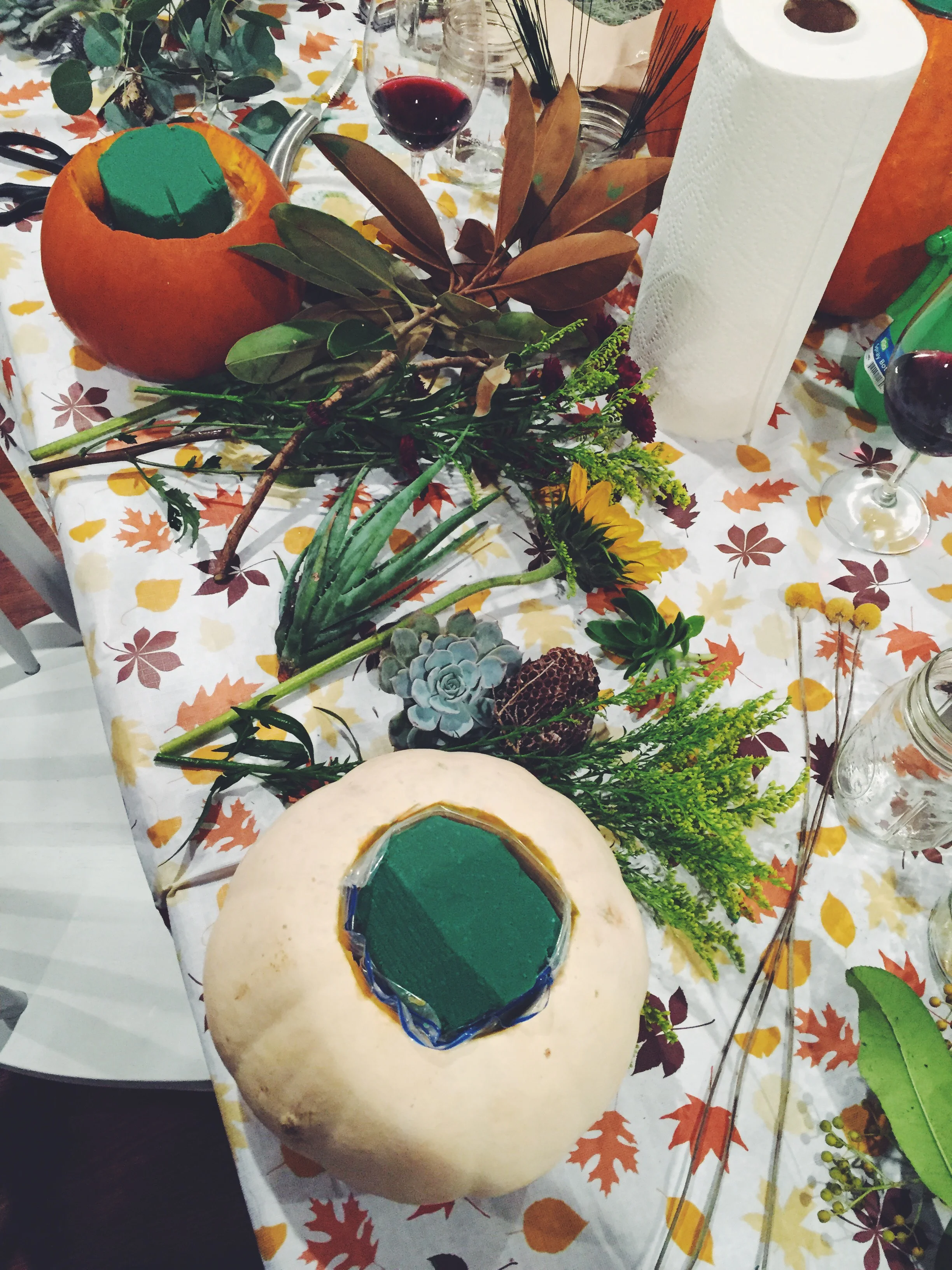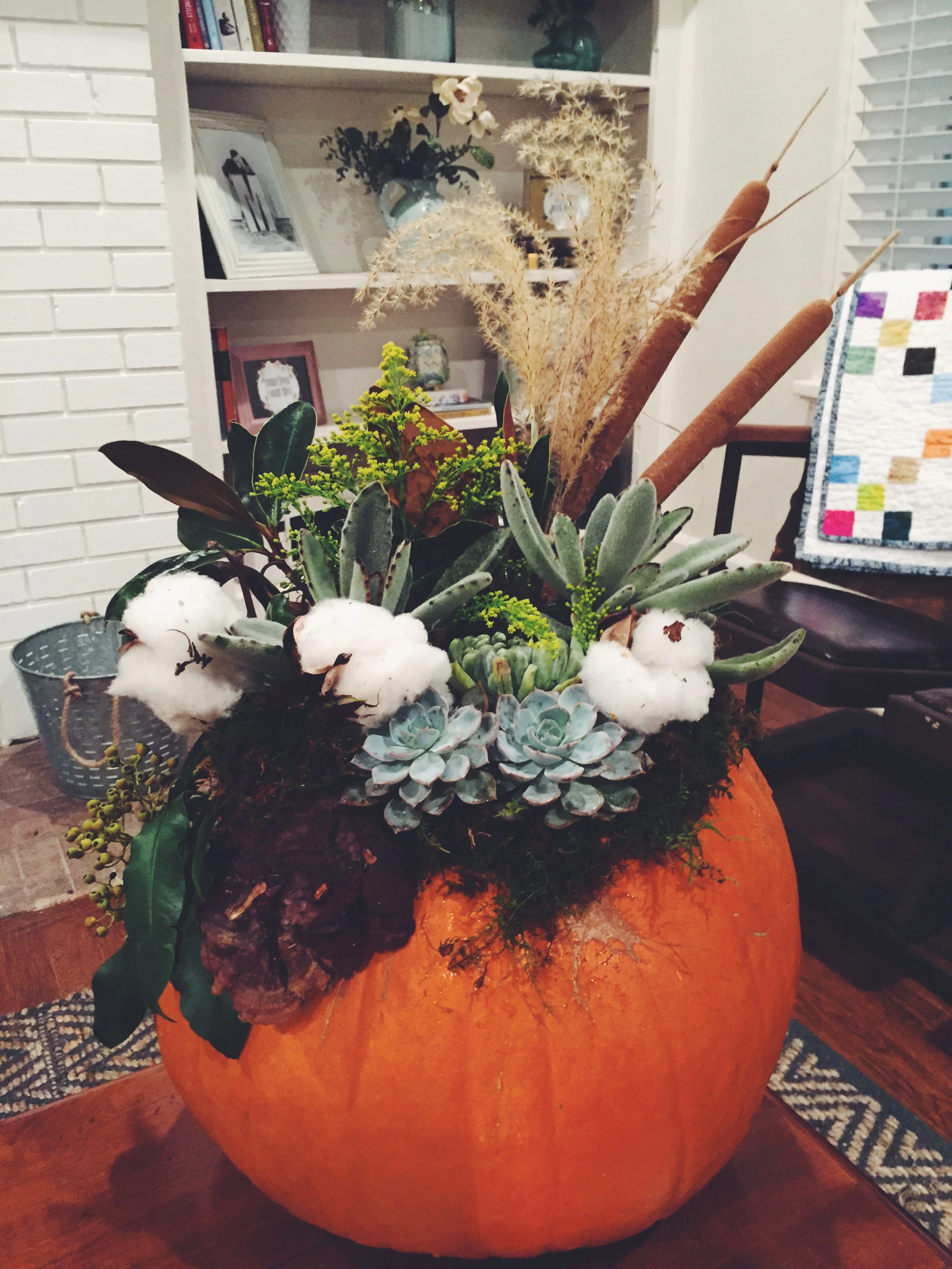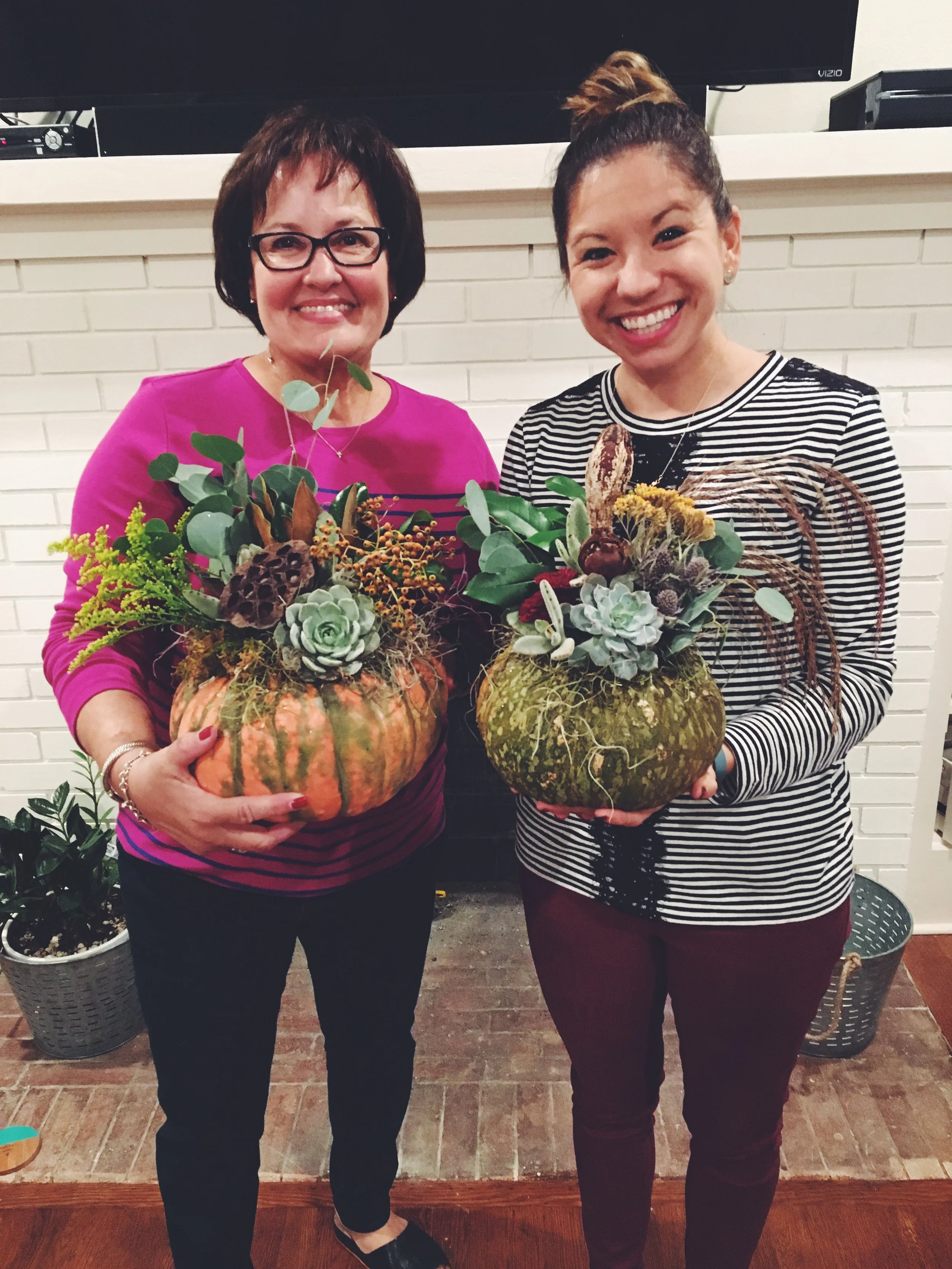 I am so fortunate to be able to offer these in-home parties for very enthusiastic hosts and their guests. The idea is that you invite your friends over, they bring a pumpkin, and I help you fill it with succulents, flora, and other elements from nature.