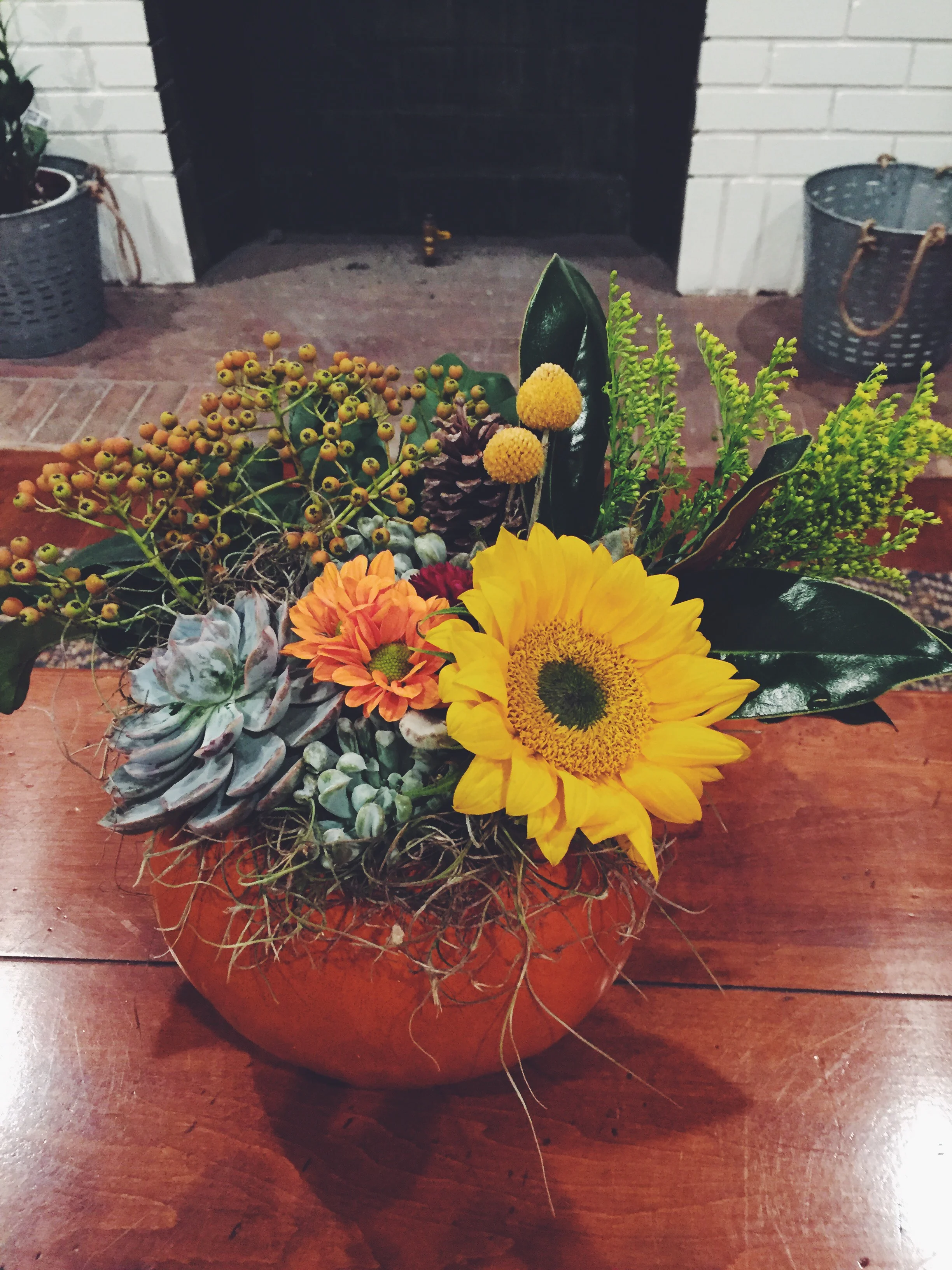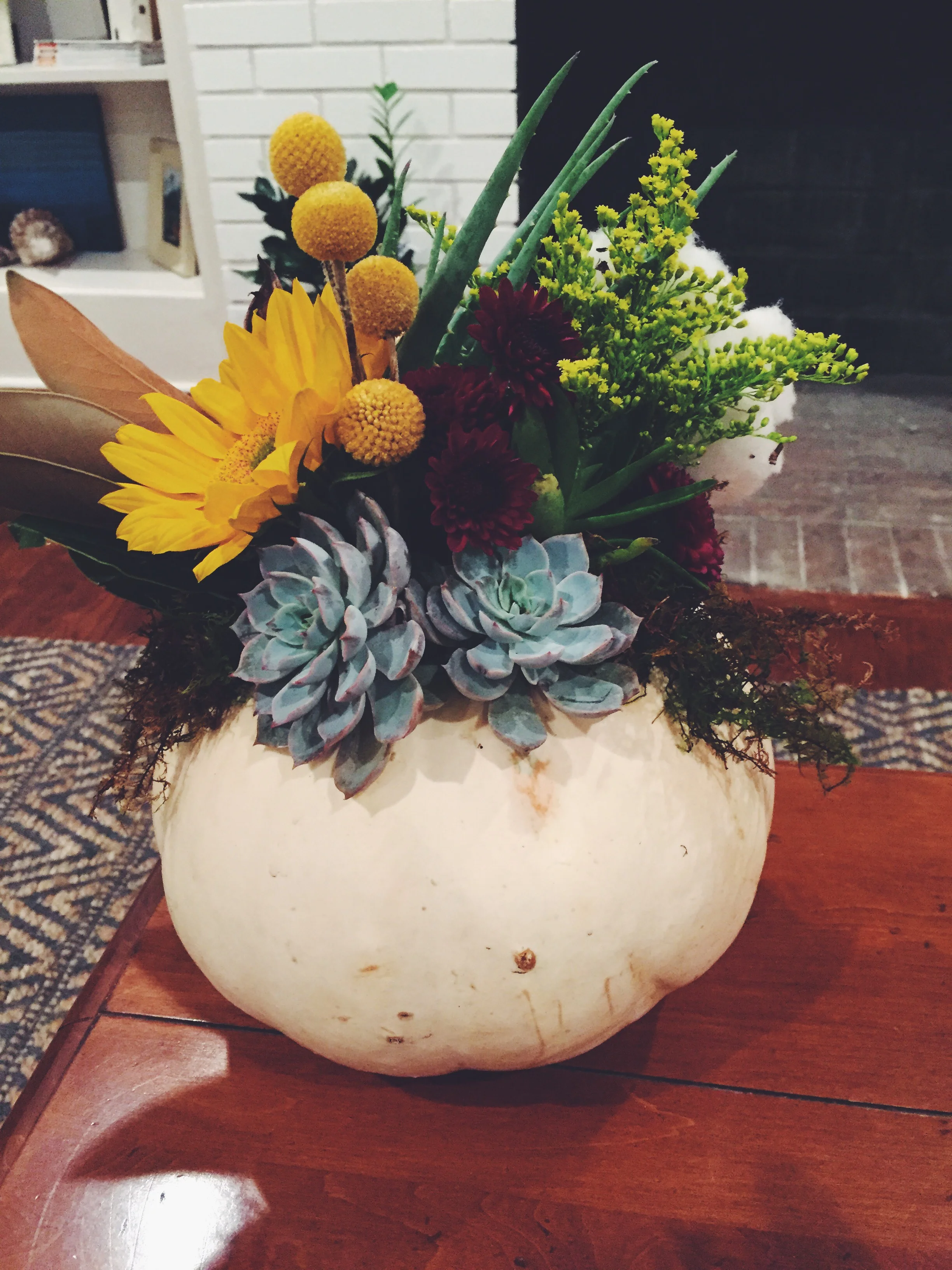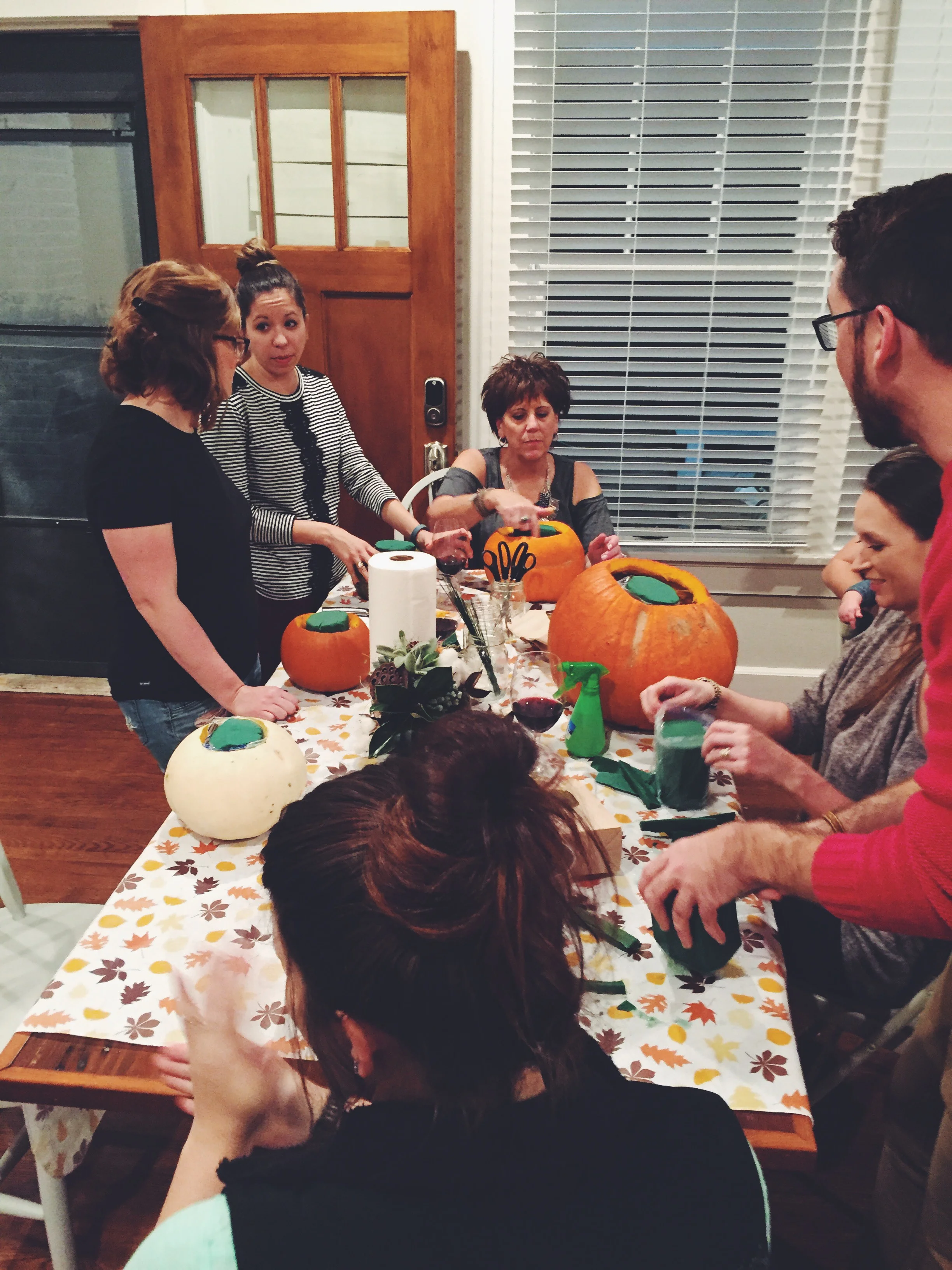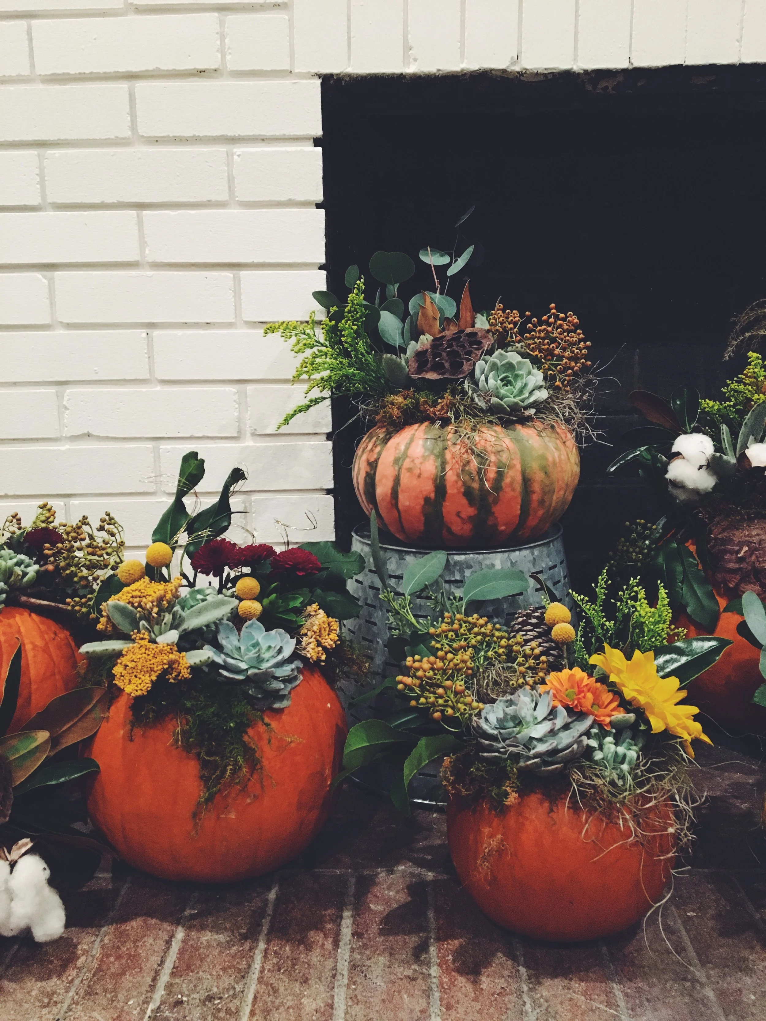 I am so fortunate to be able to offer these in-home parties for very enthusiastic hosts and their guests. The idea is that you invite your friends over, they bring a pumpkin, and I help you fill it with succulents, flora, and other elements from nature.
